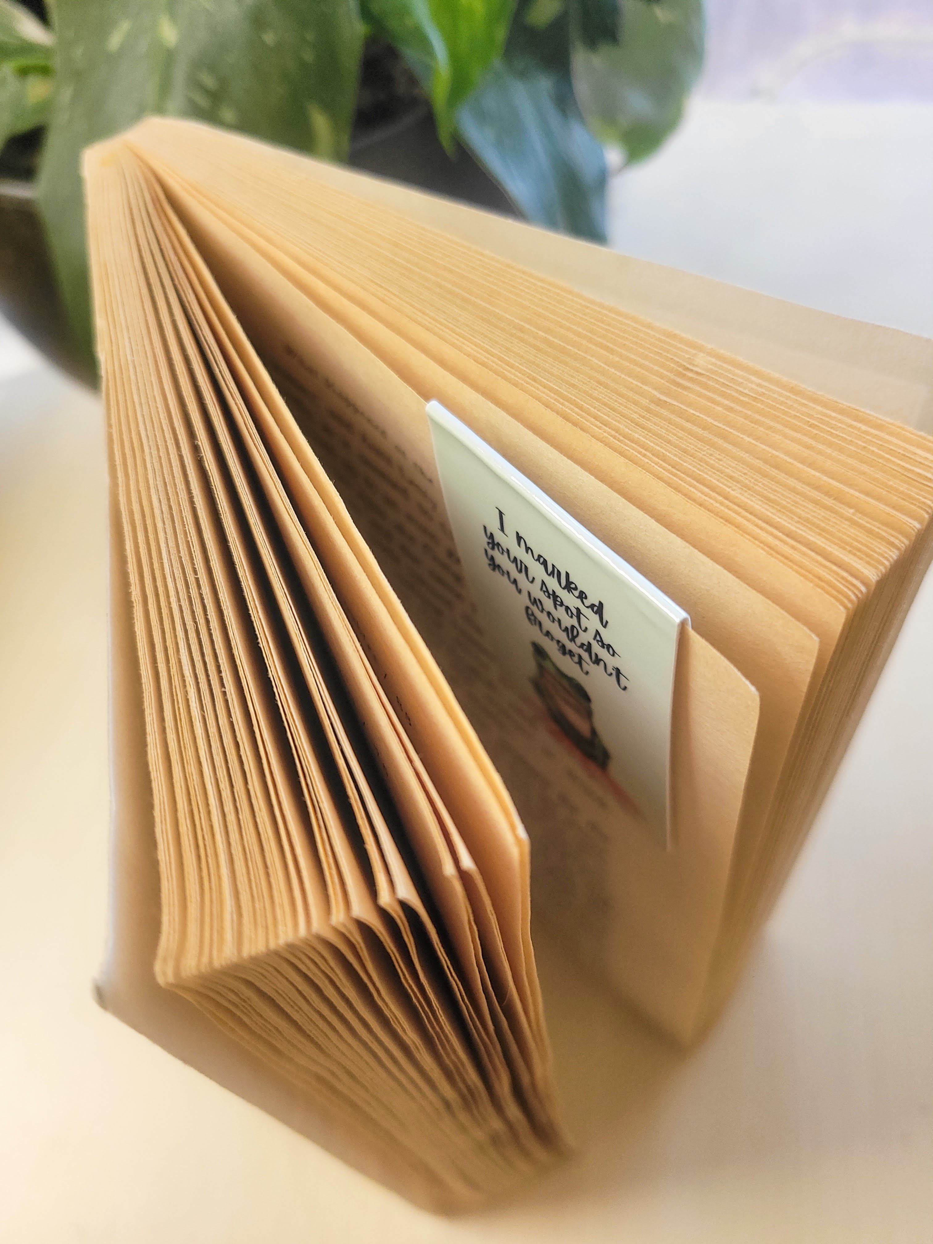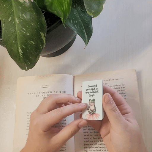 All bookmarks are printed on cardstock and laminated for protection. These are magnetic bookmarks, which are folded over a page and two magnets hold it in place.