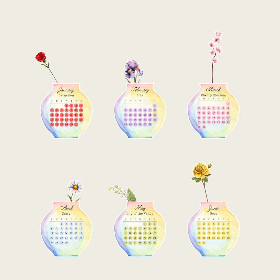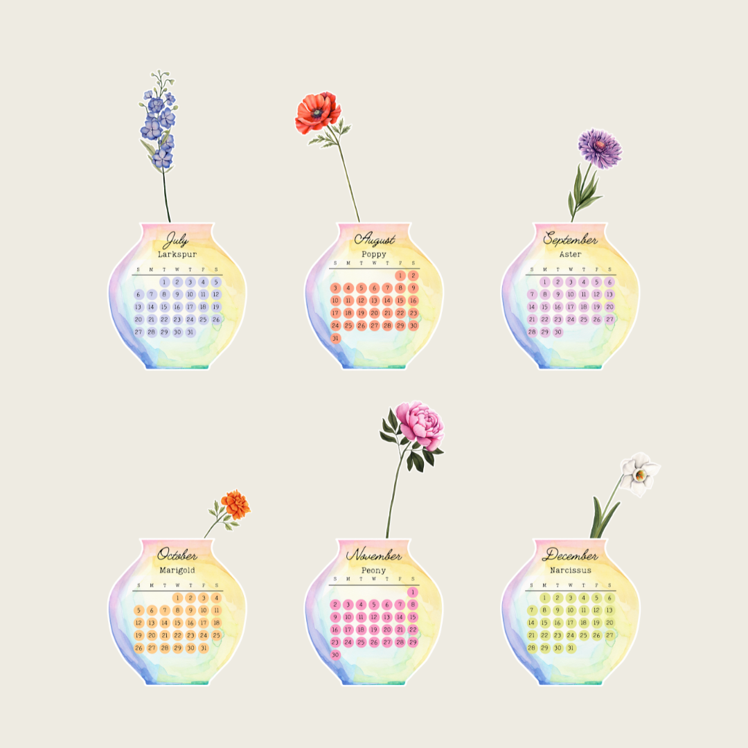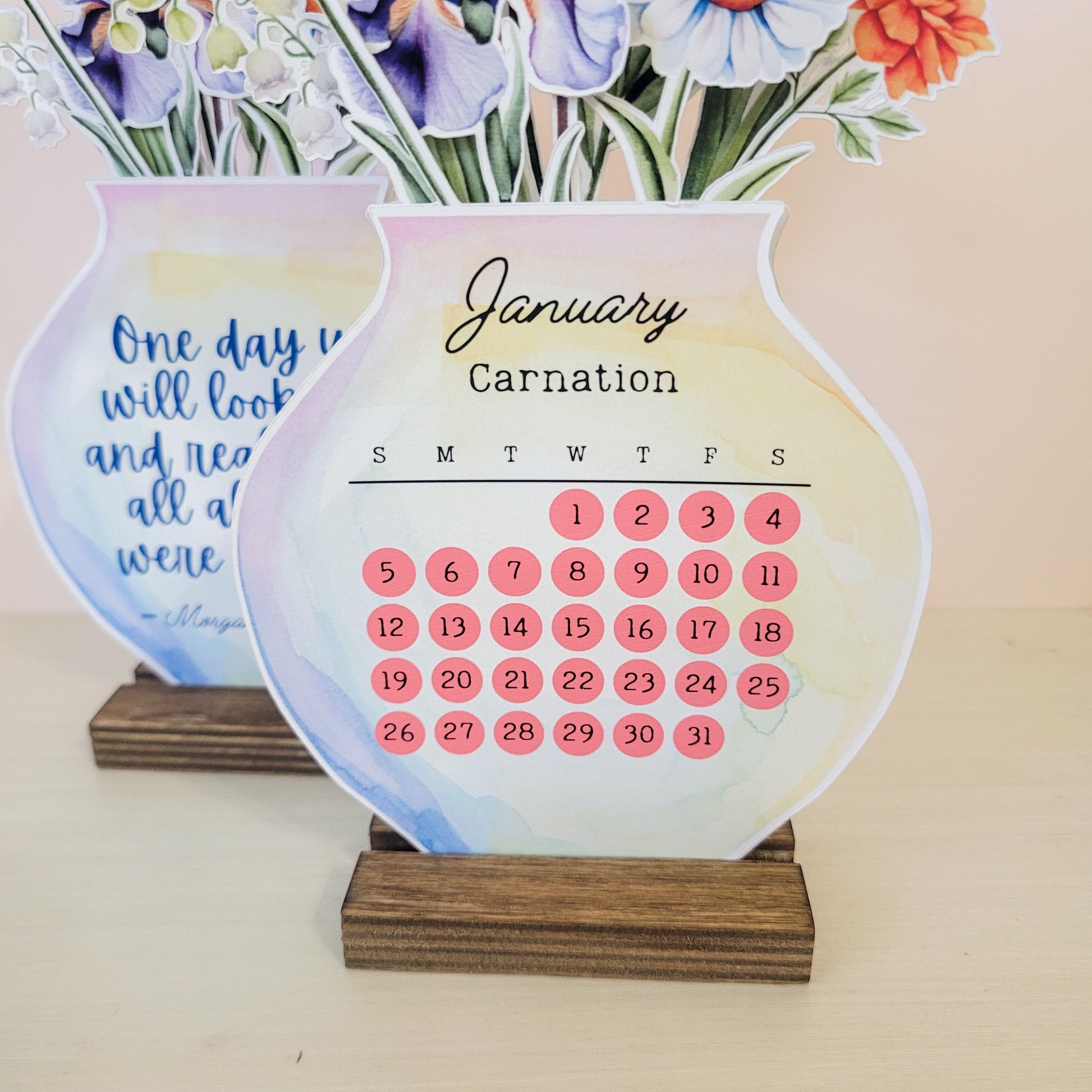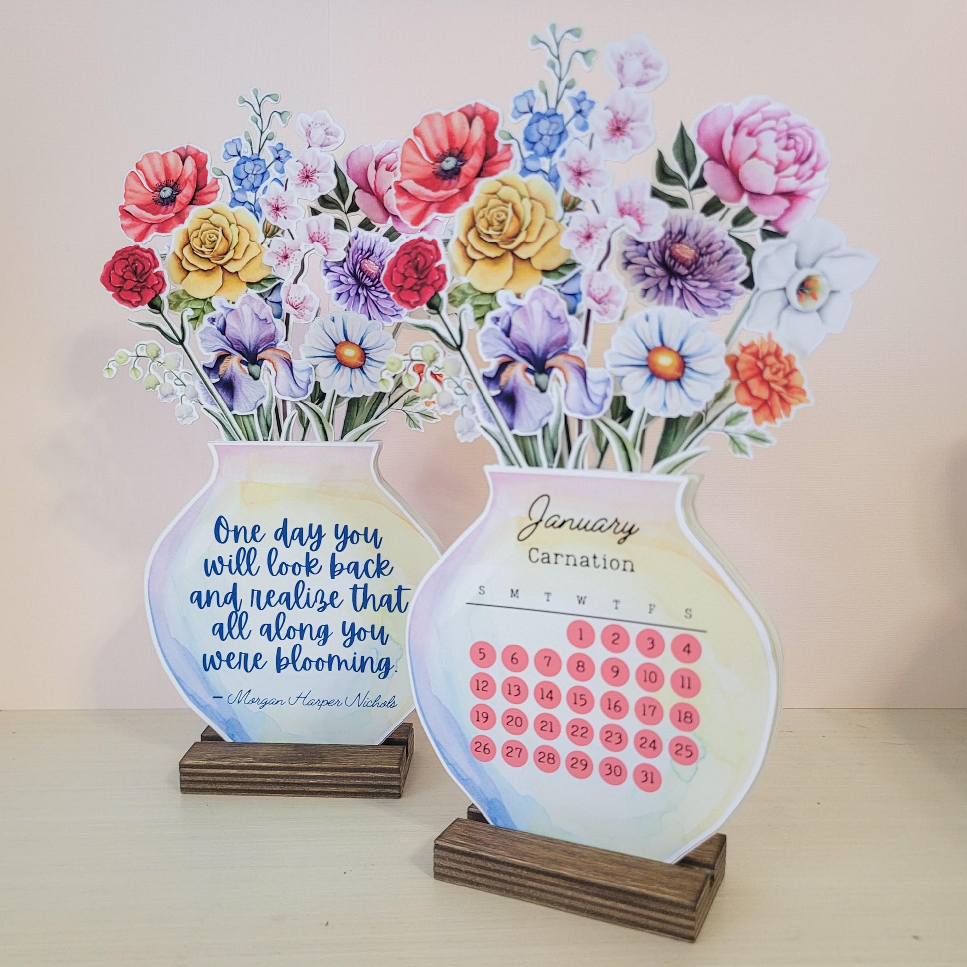 This free standing desk calendar includes each month with it's coordinating birth flower as a cutout that can be rotated as the months pass. The calendar creates a bouquet while combined. Once the year is finished, you can place the quote in front and have piece of décor for your desk or bookshelf!