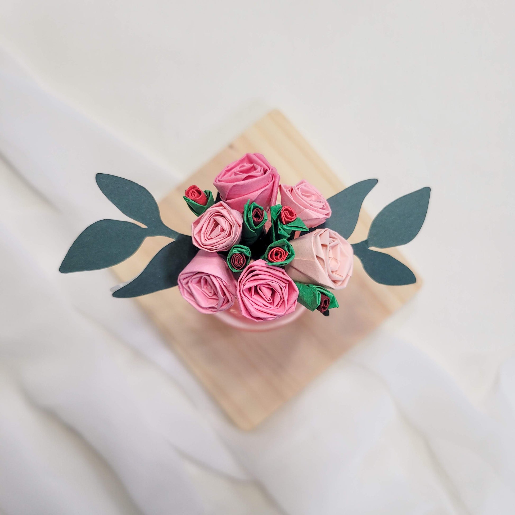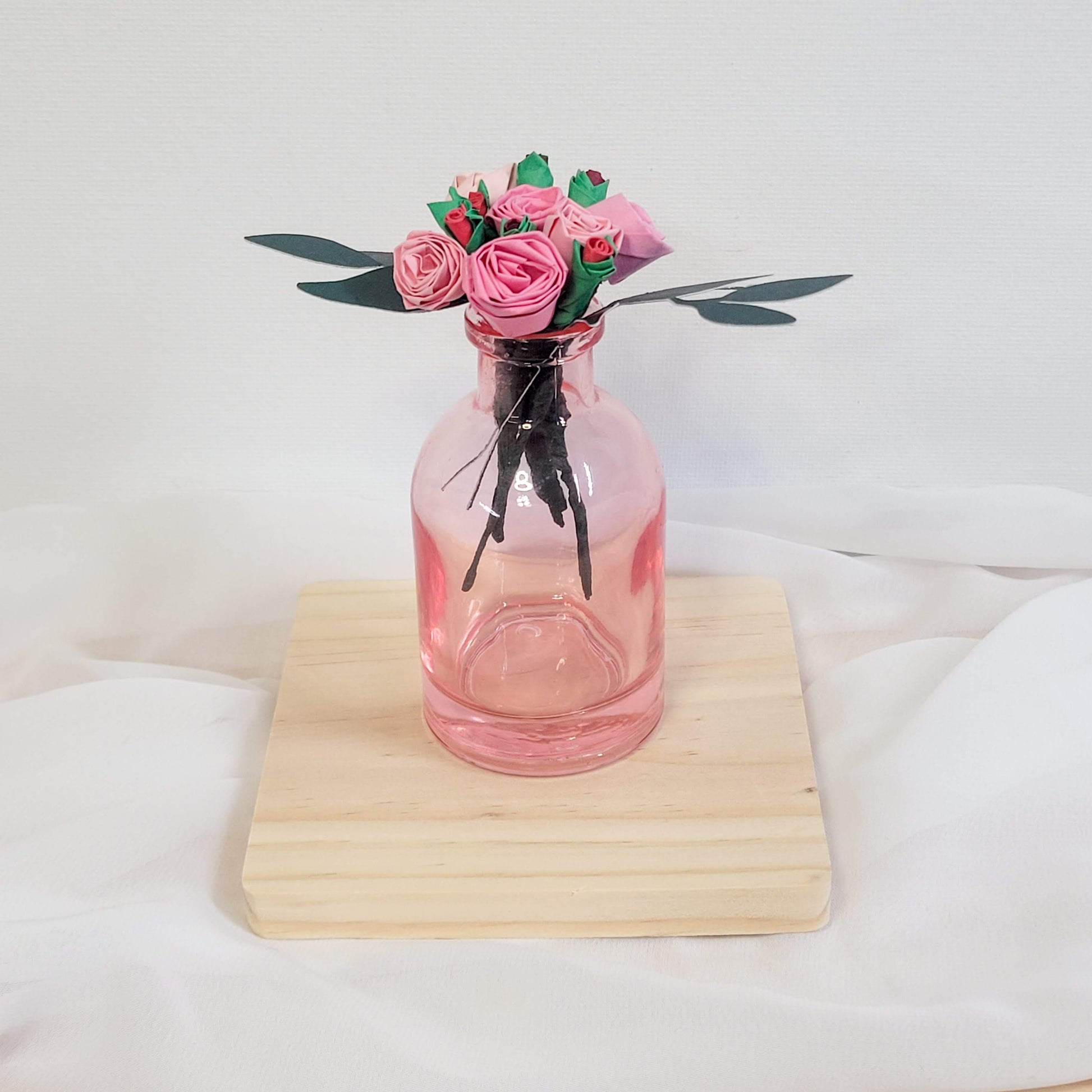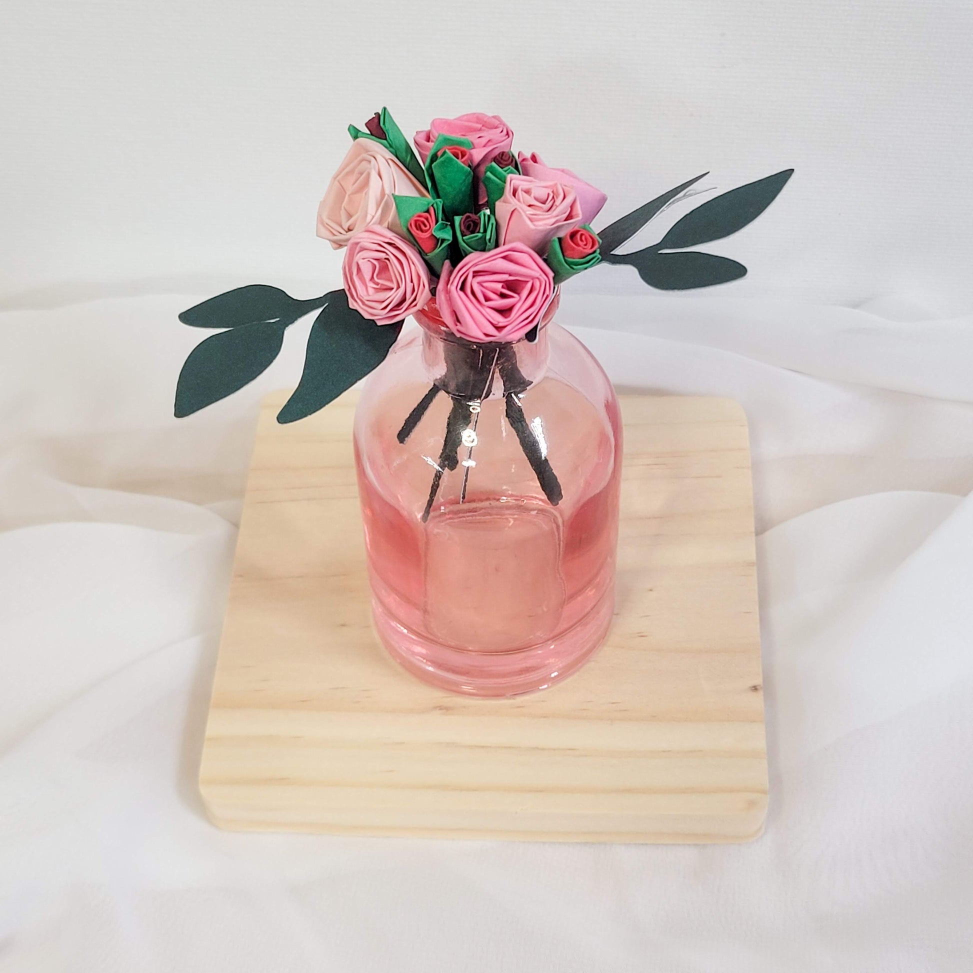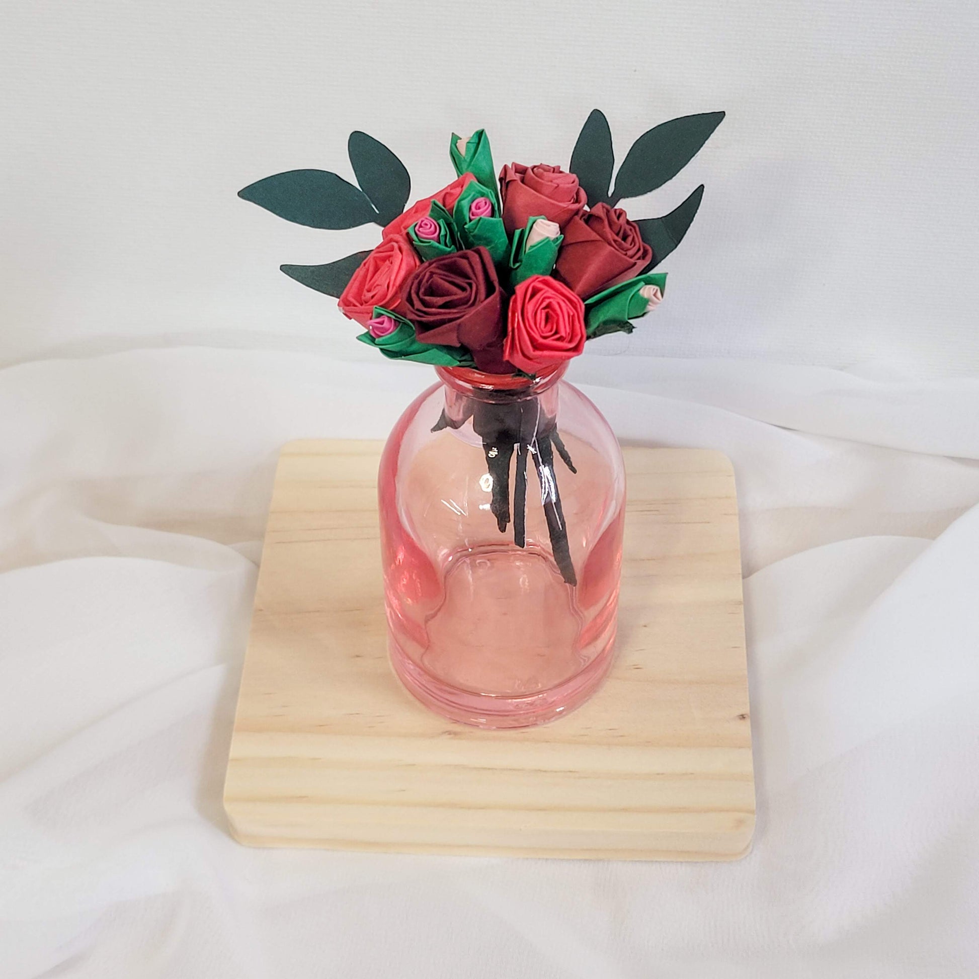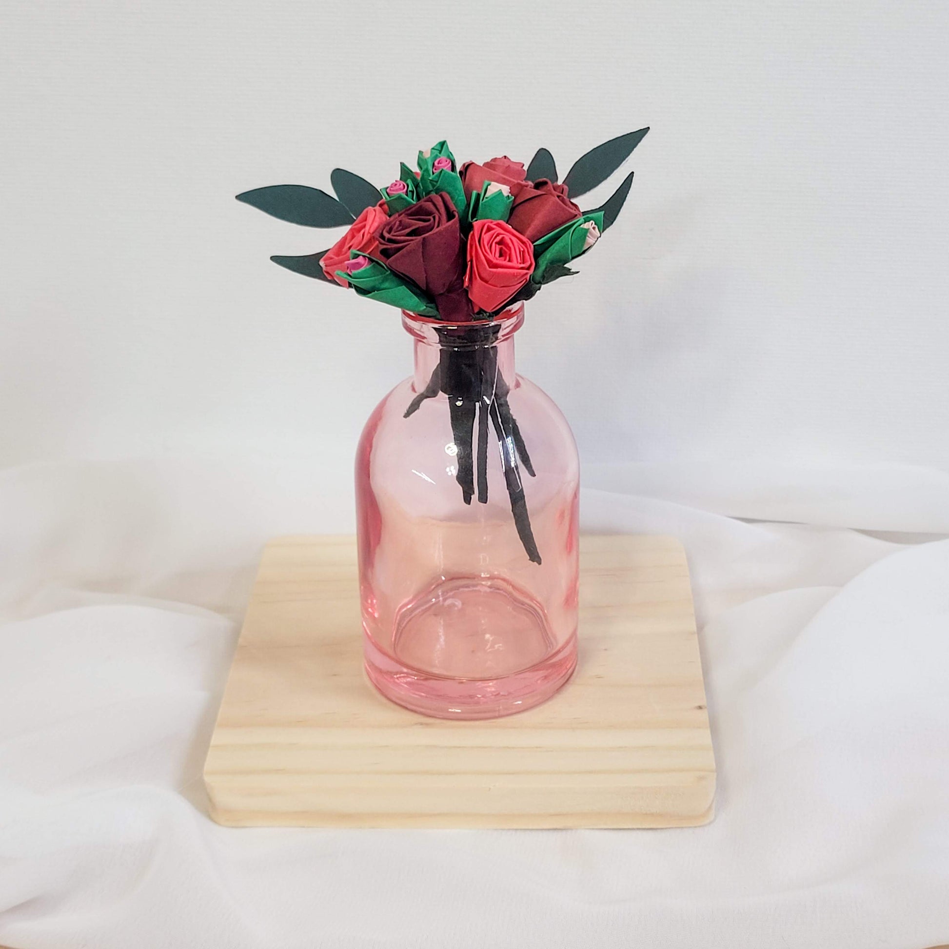 This mini paper rose bouquet comes in a variety of colors. It’s a mix of full blooms and buds. It is accented with greenery for added character. Vase color and style are subject to random selection, but requests can be made.