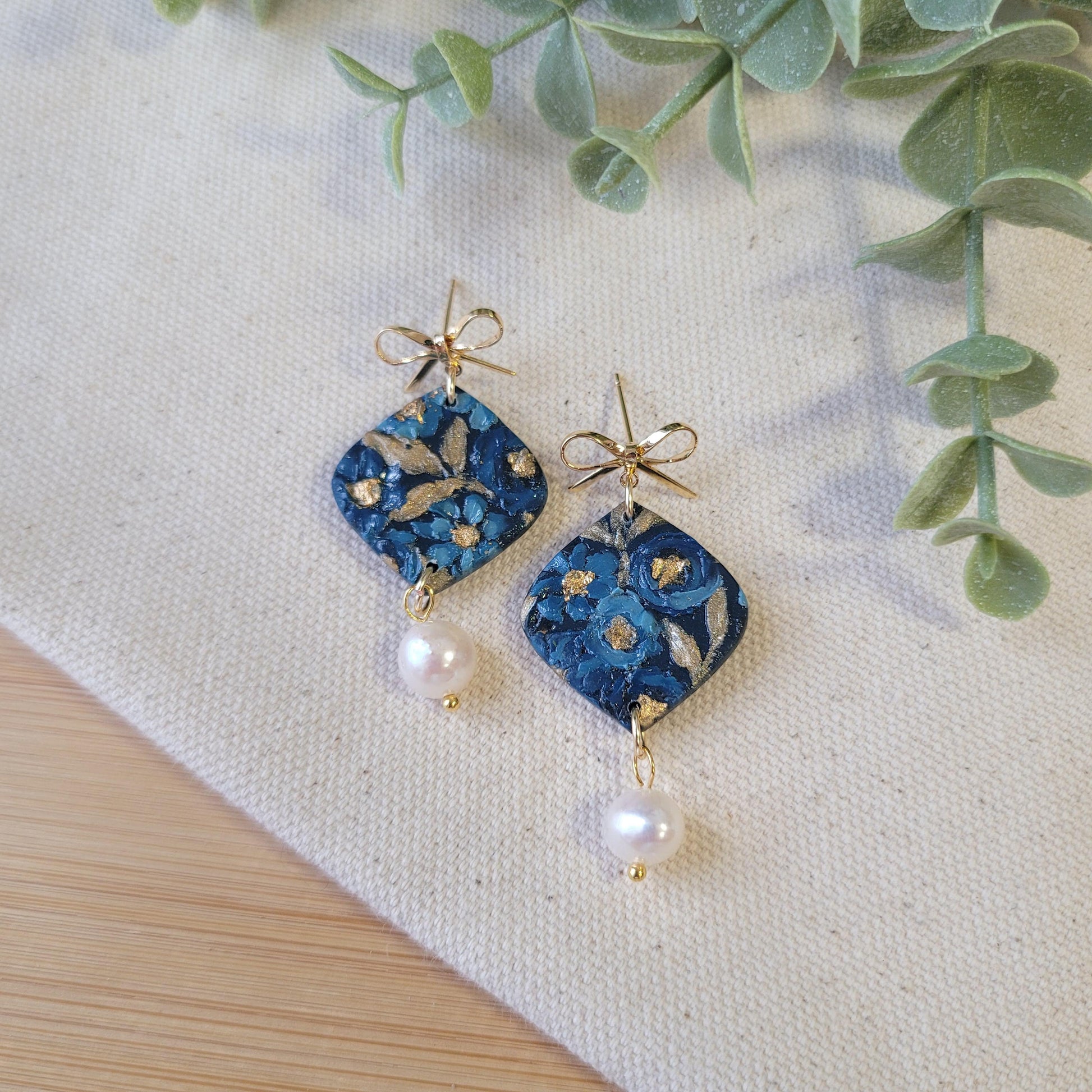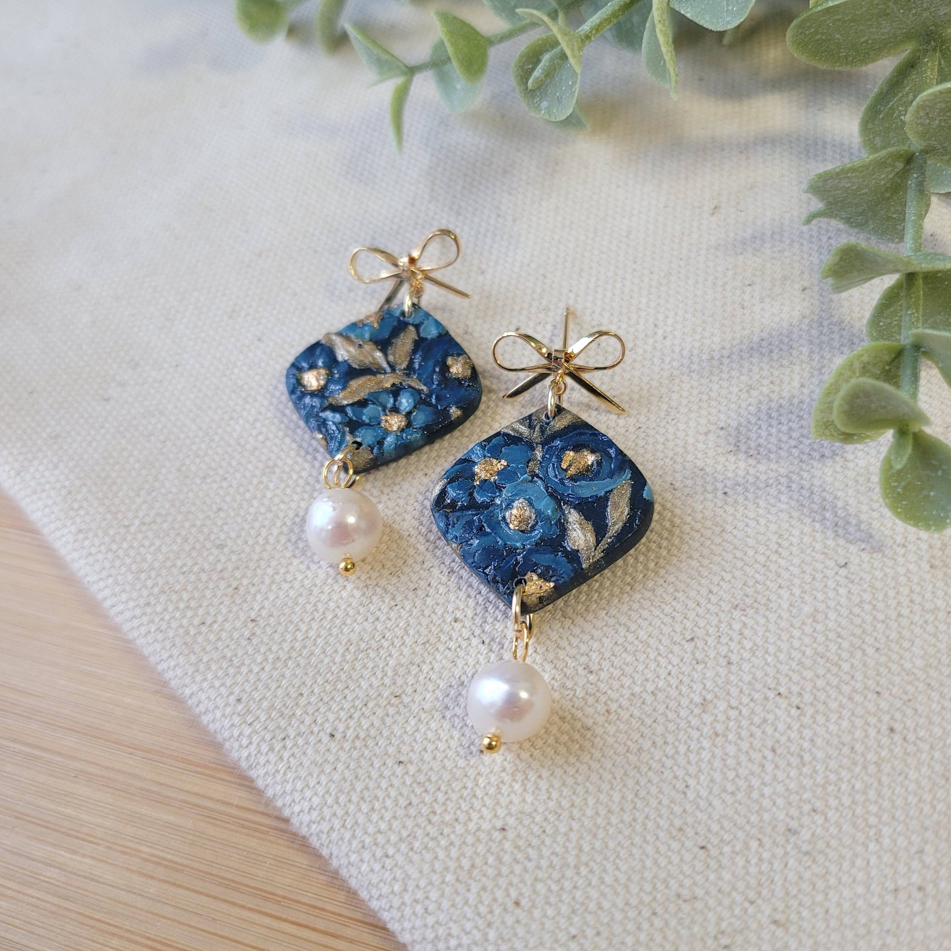 Monochromatic blue "painted" florals with gold details and a pearl dangle.