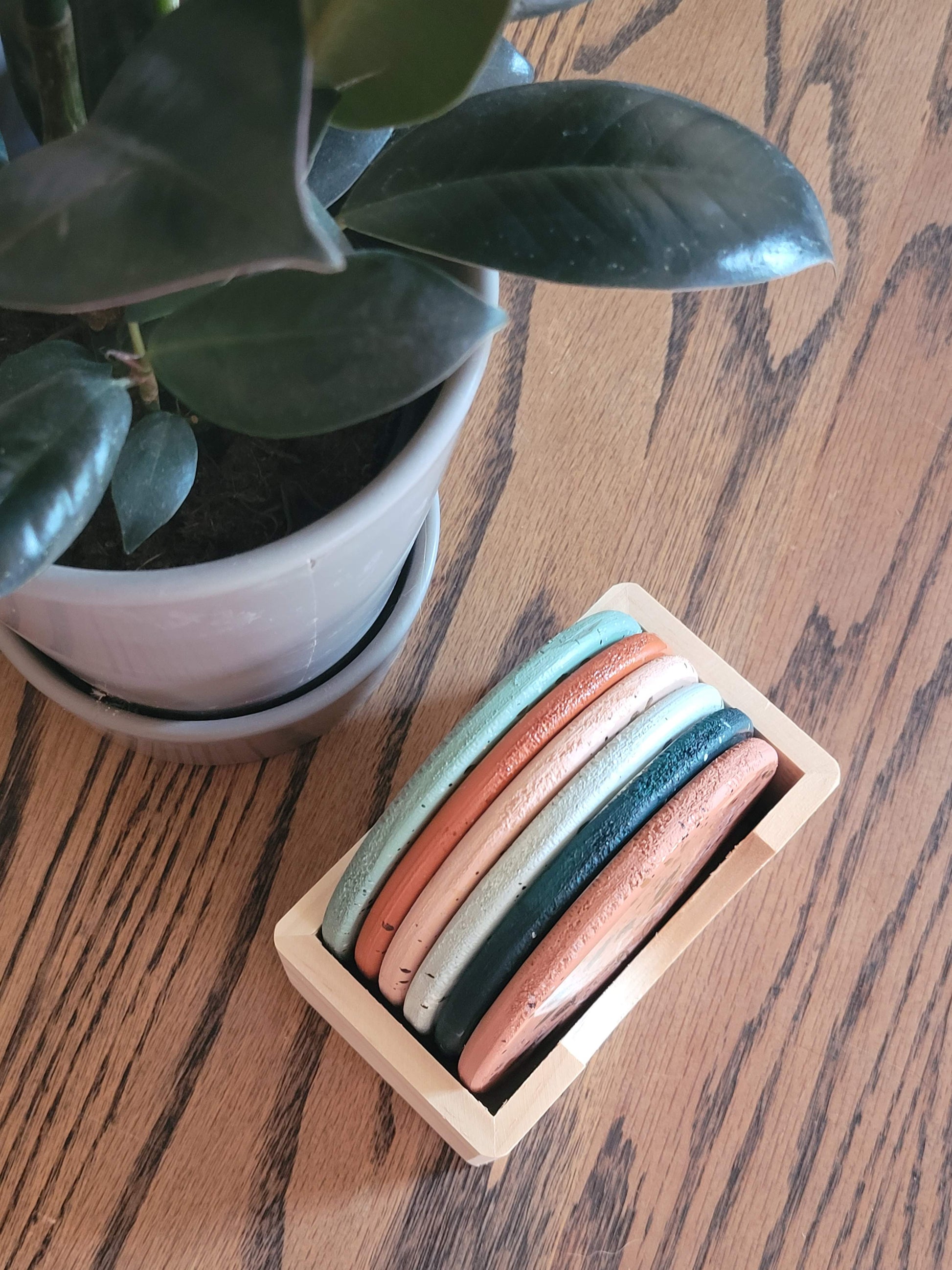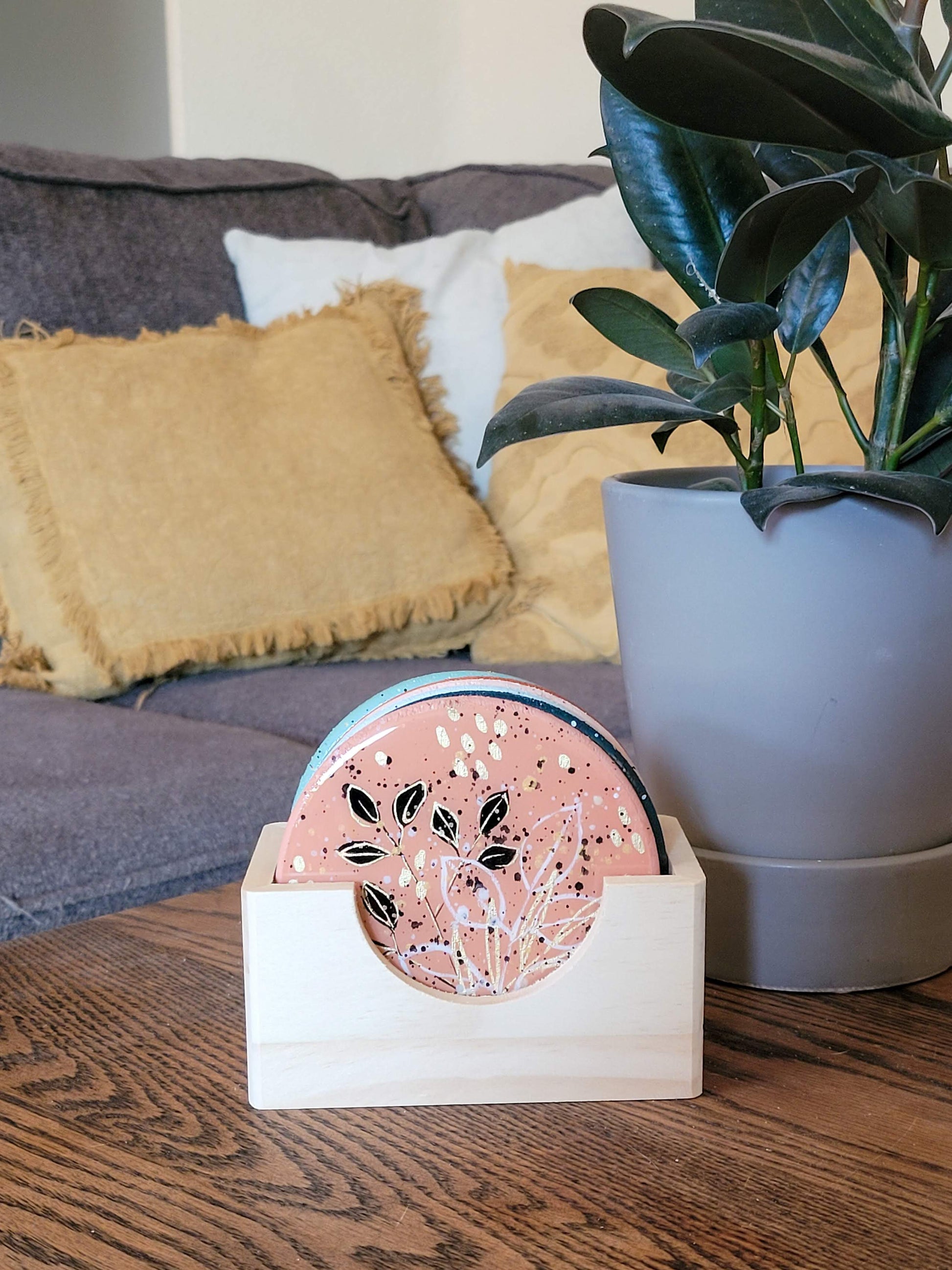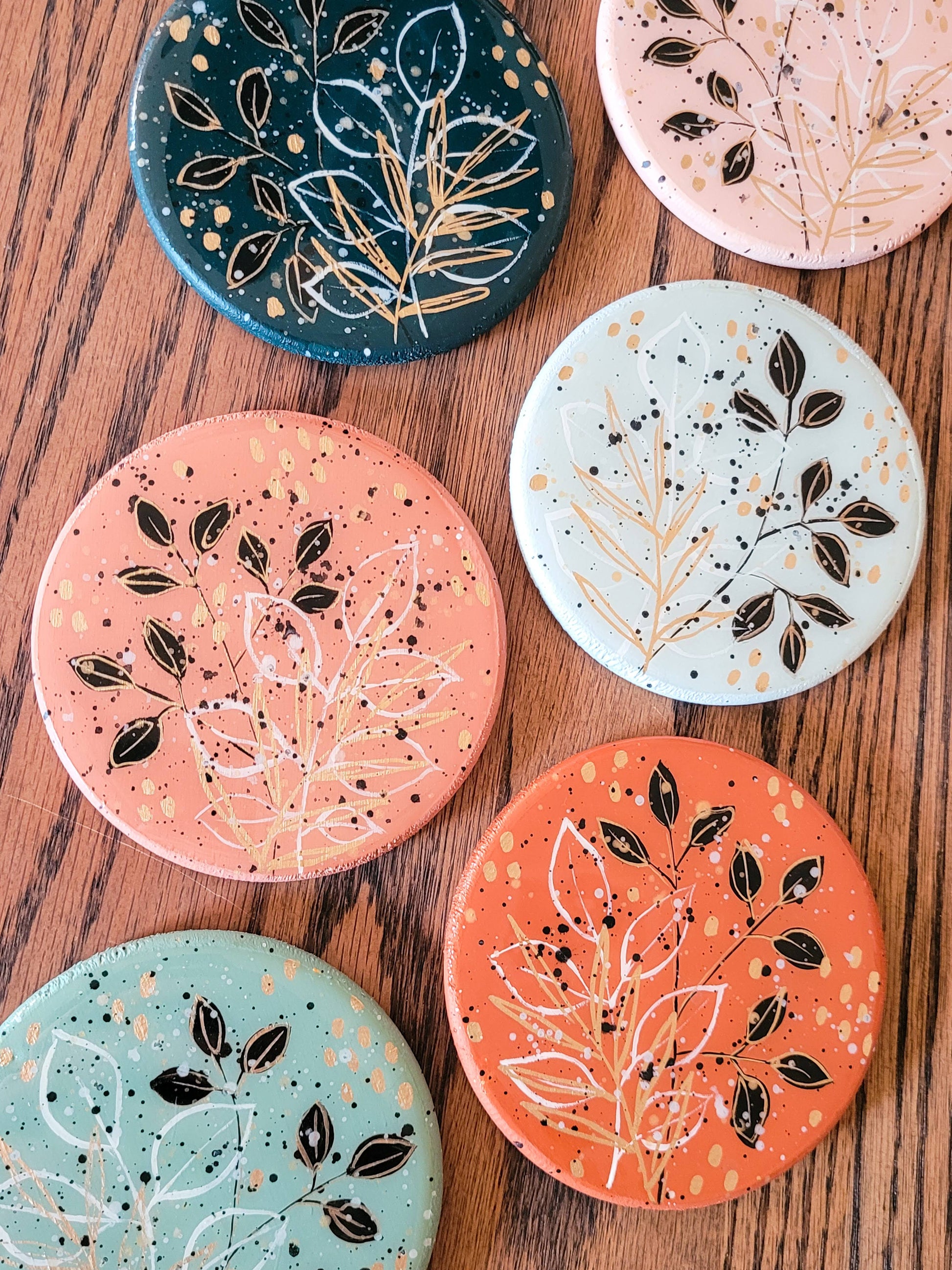 6 painted coasters with an epoxy resin coating. The set comes with the container for them to be stored in.