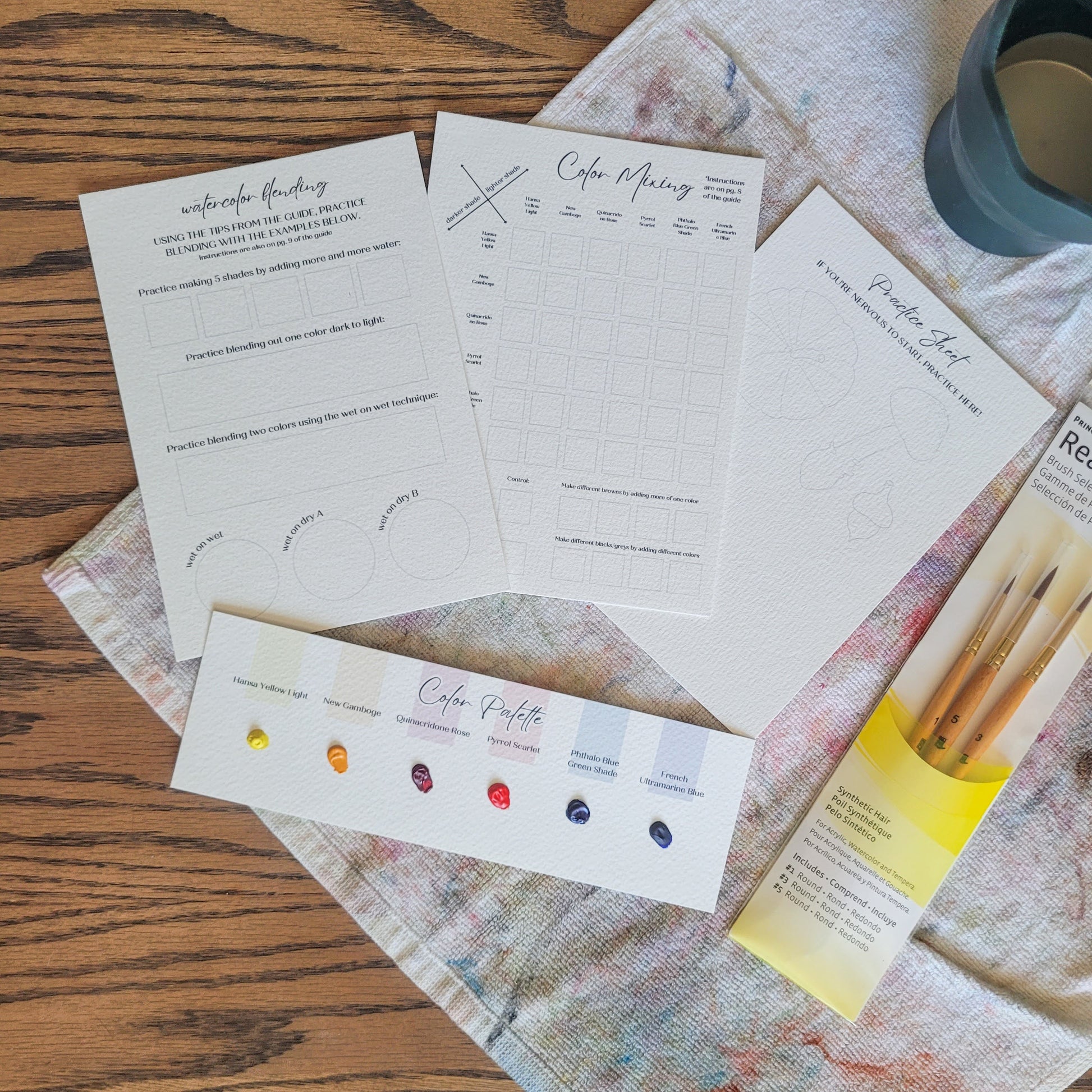 The guide includes tips and tricks, instructions for how to use the practice sheets, and pictures of my finished pieces for reference. None of which are required to enjoy this kit, but may be helpful if you're new to watercolor!