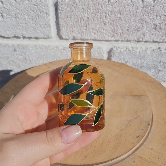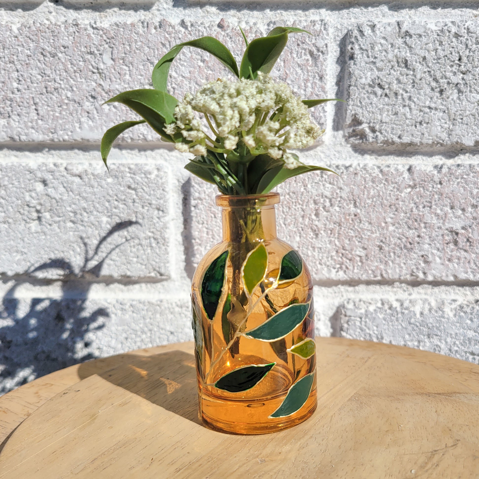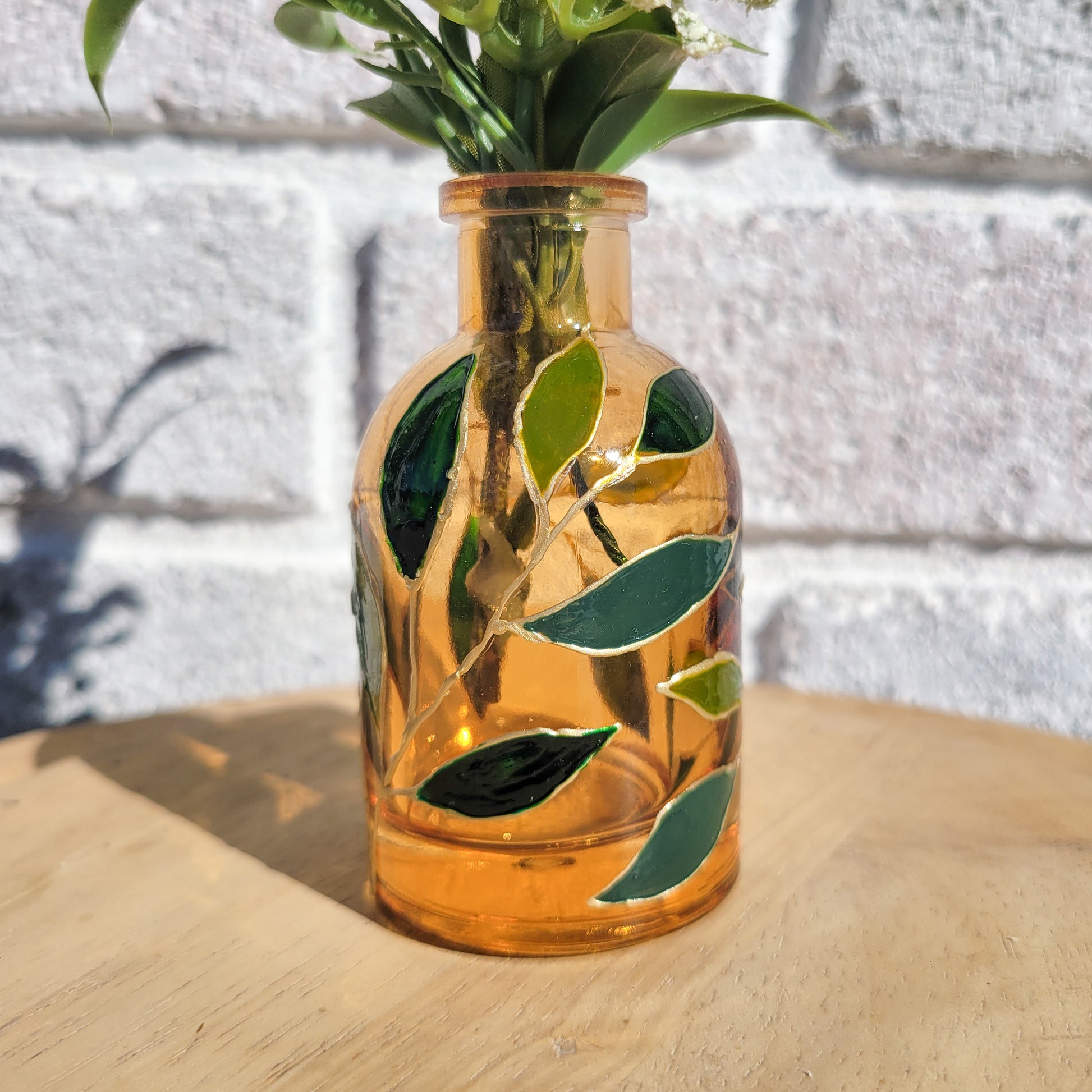 Amber vase with different shades of green leaves.