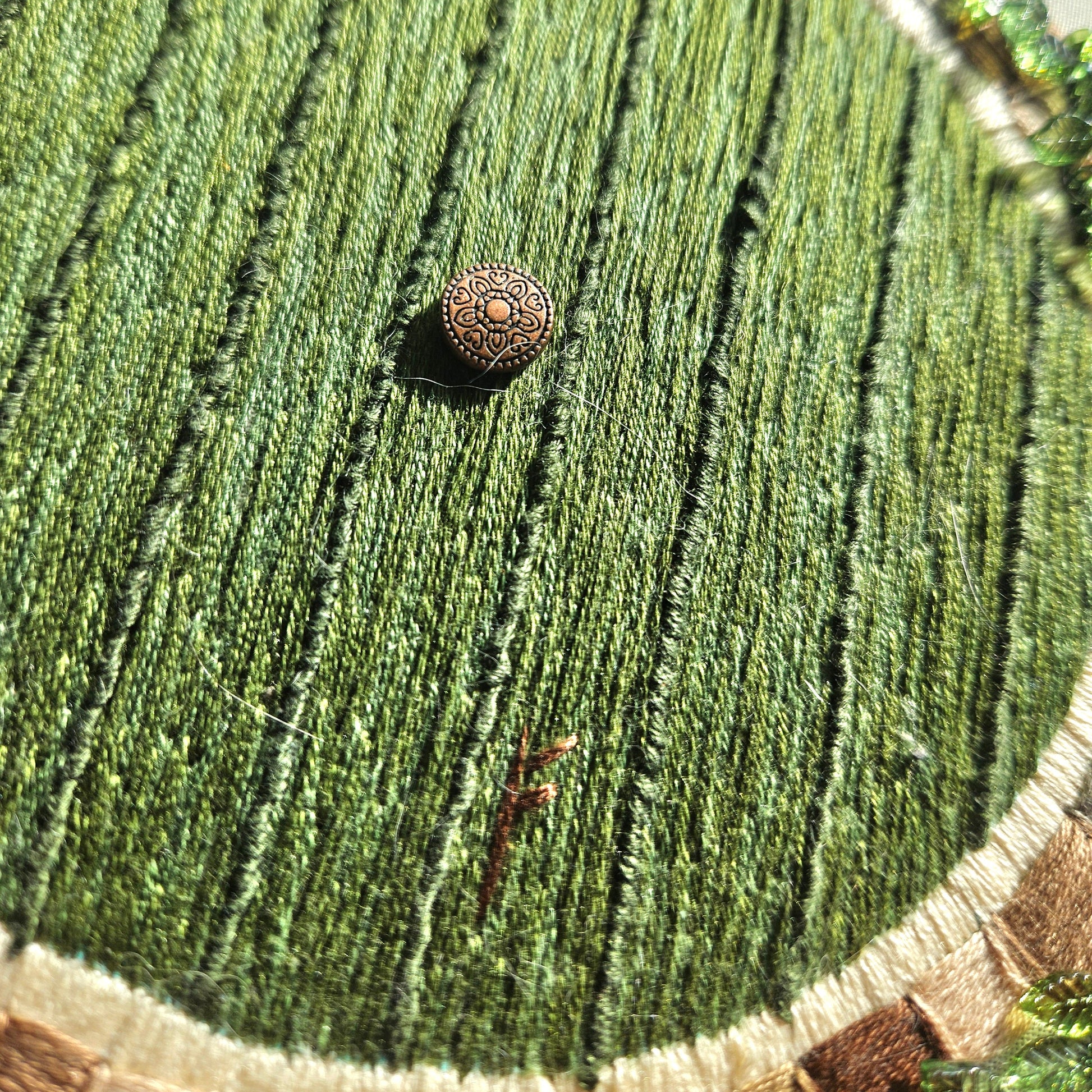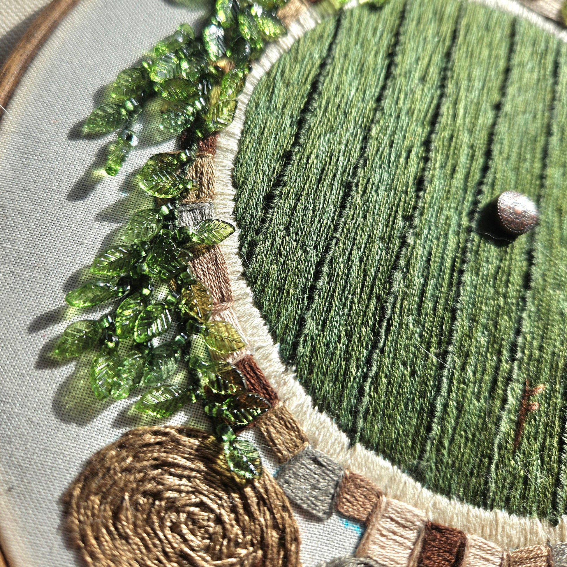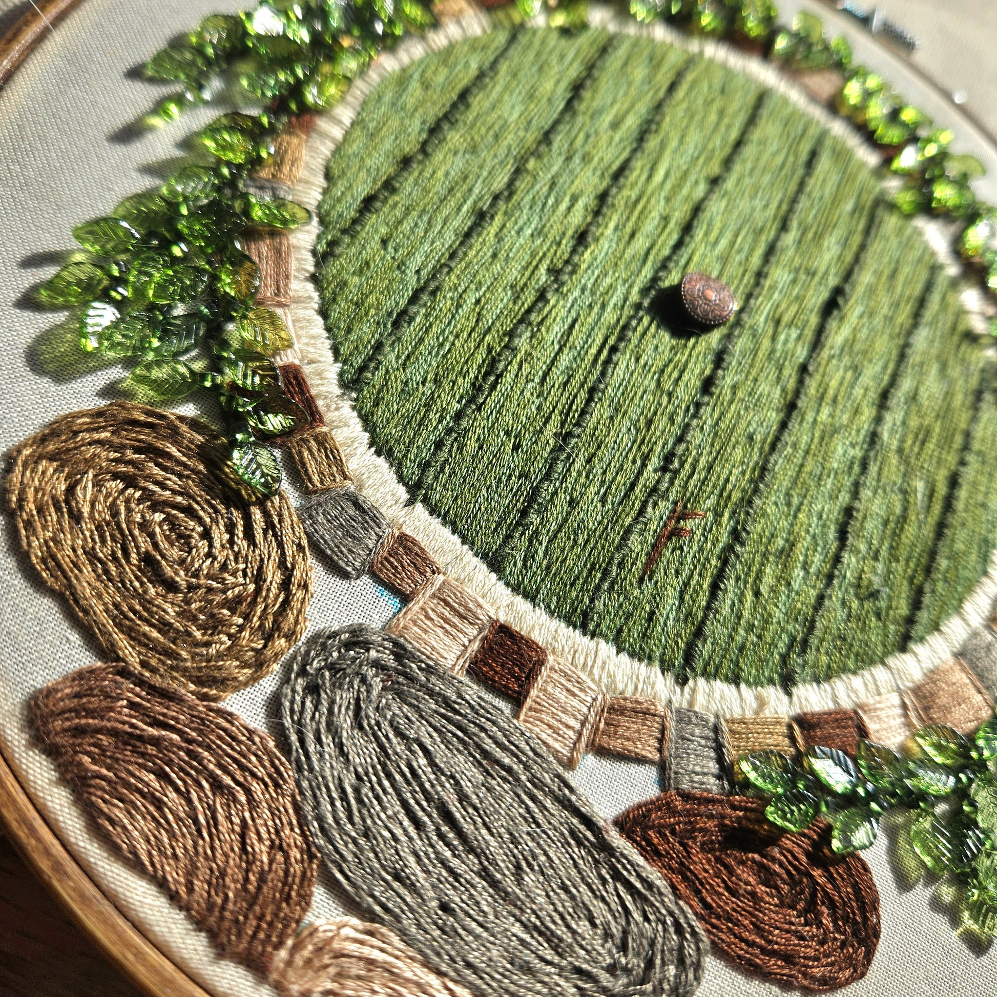 Hand embroidered design of a hobbit hole door on an 8 in hoop. Features beaded ivy and doorknob.