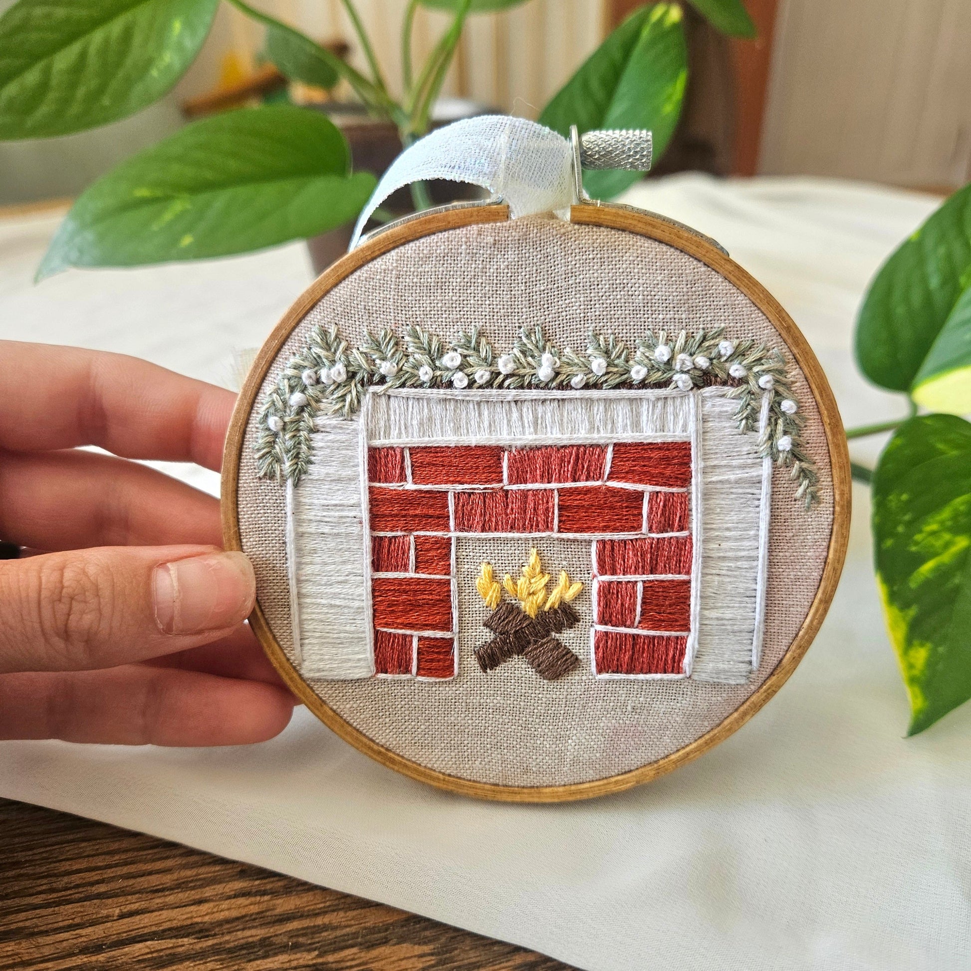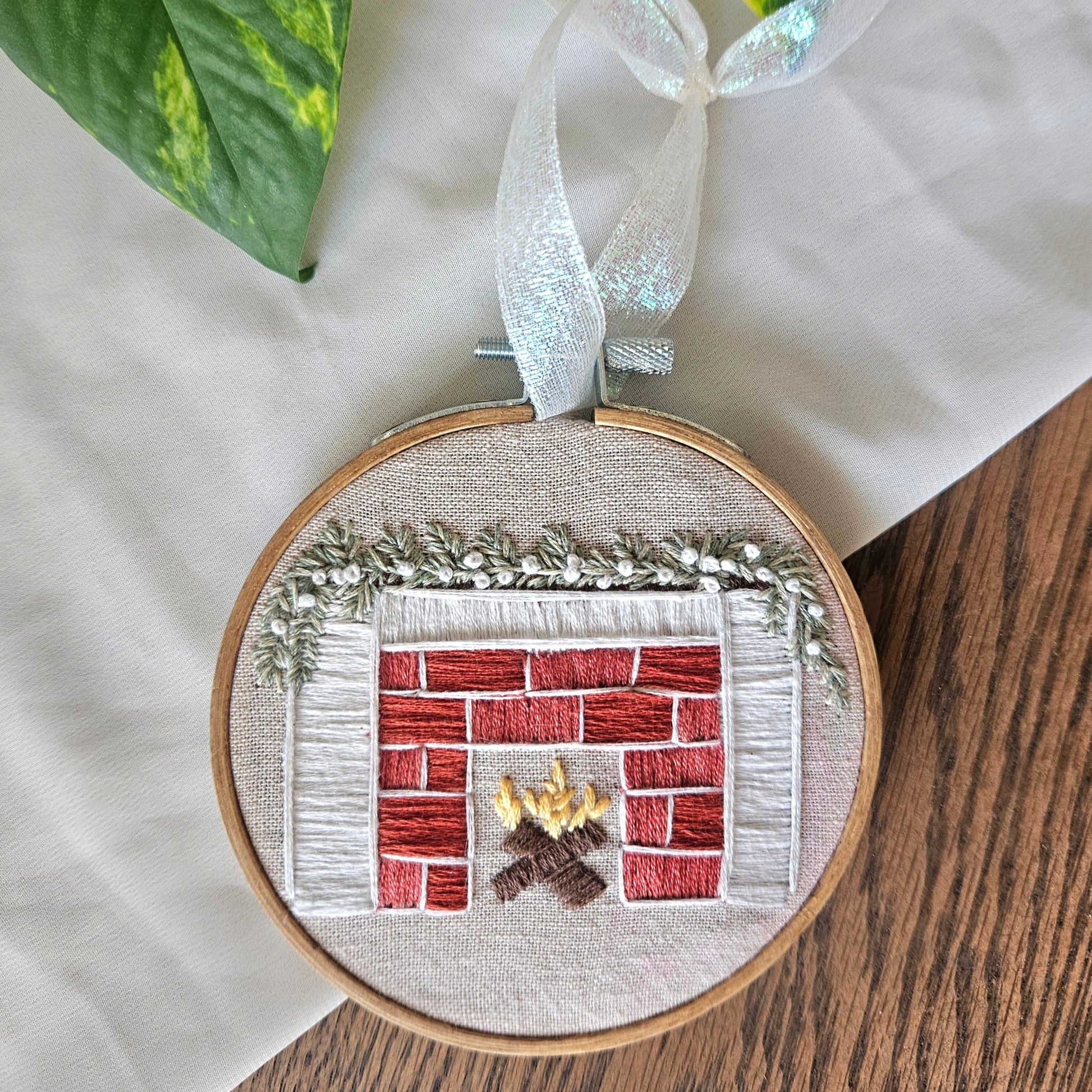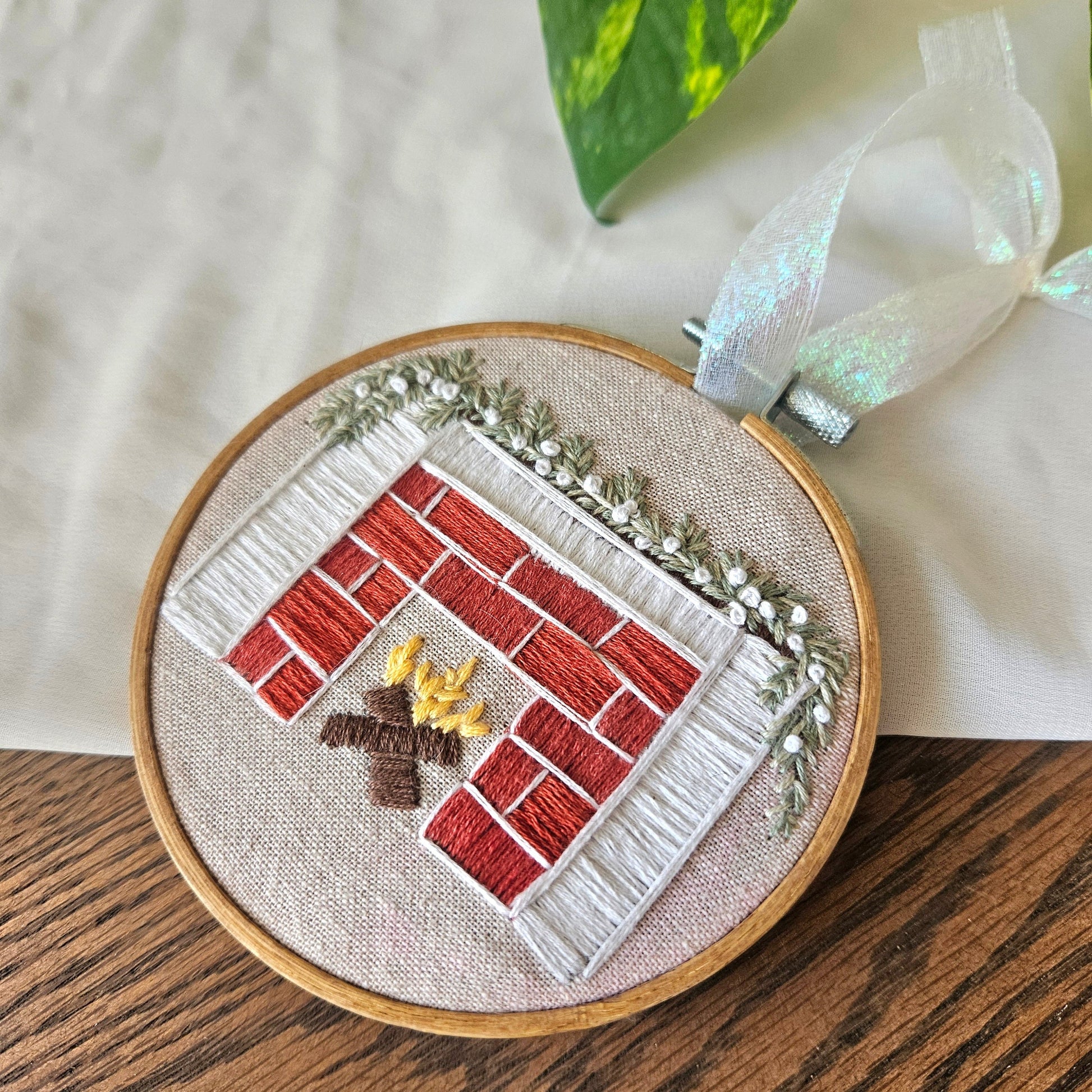 Hand embroidered design of a lit fireplace with holiday garland on the mantle on a 4 in hoop.