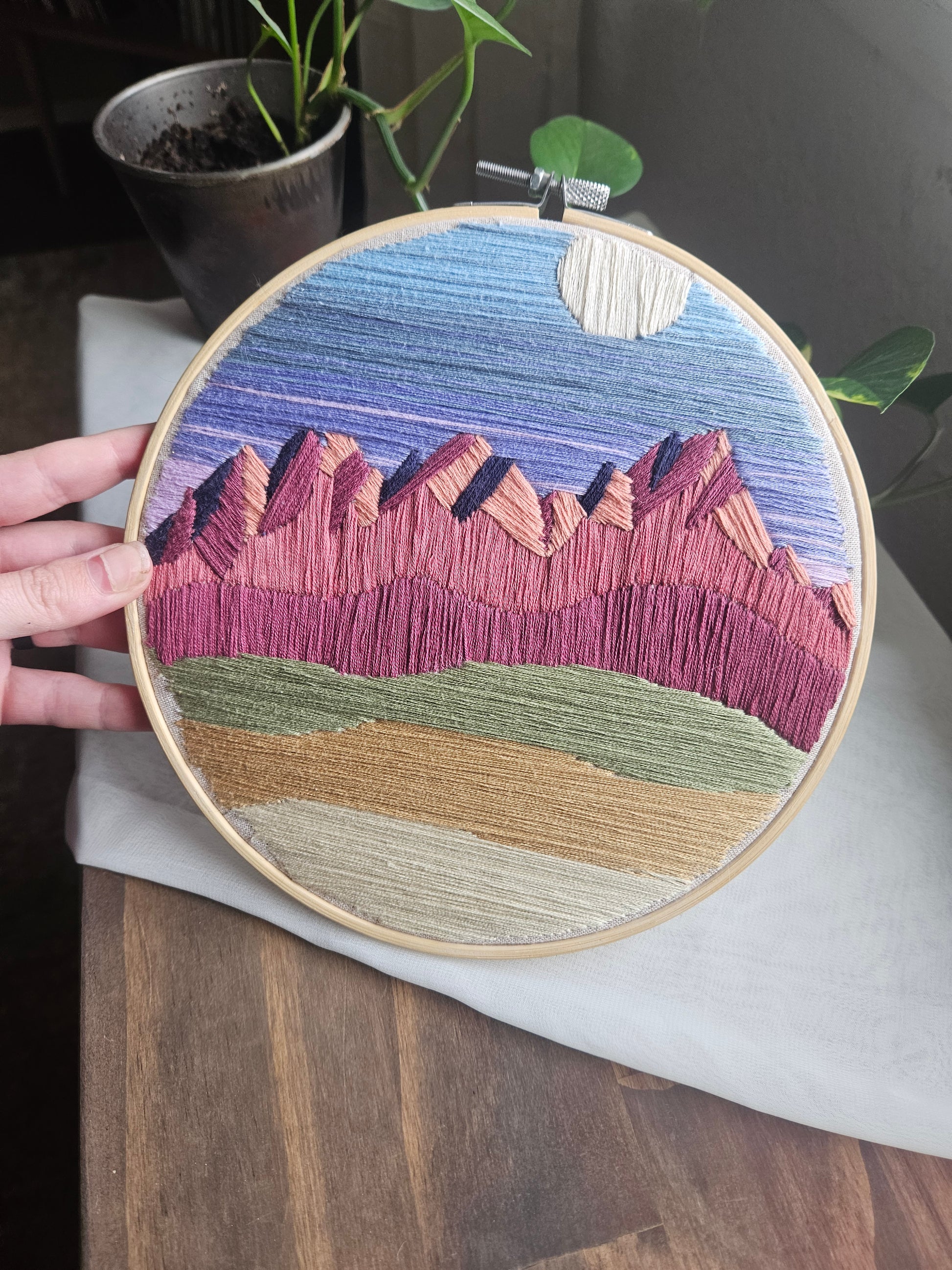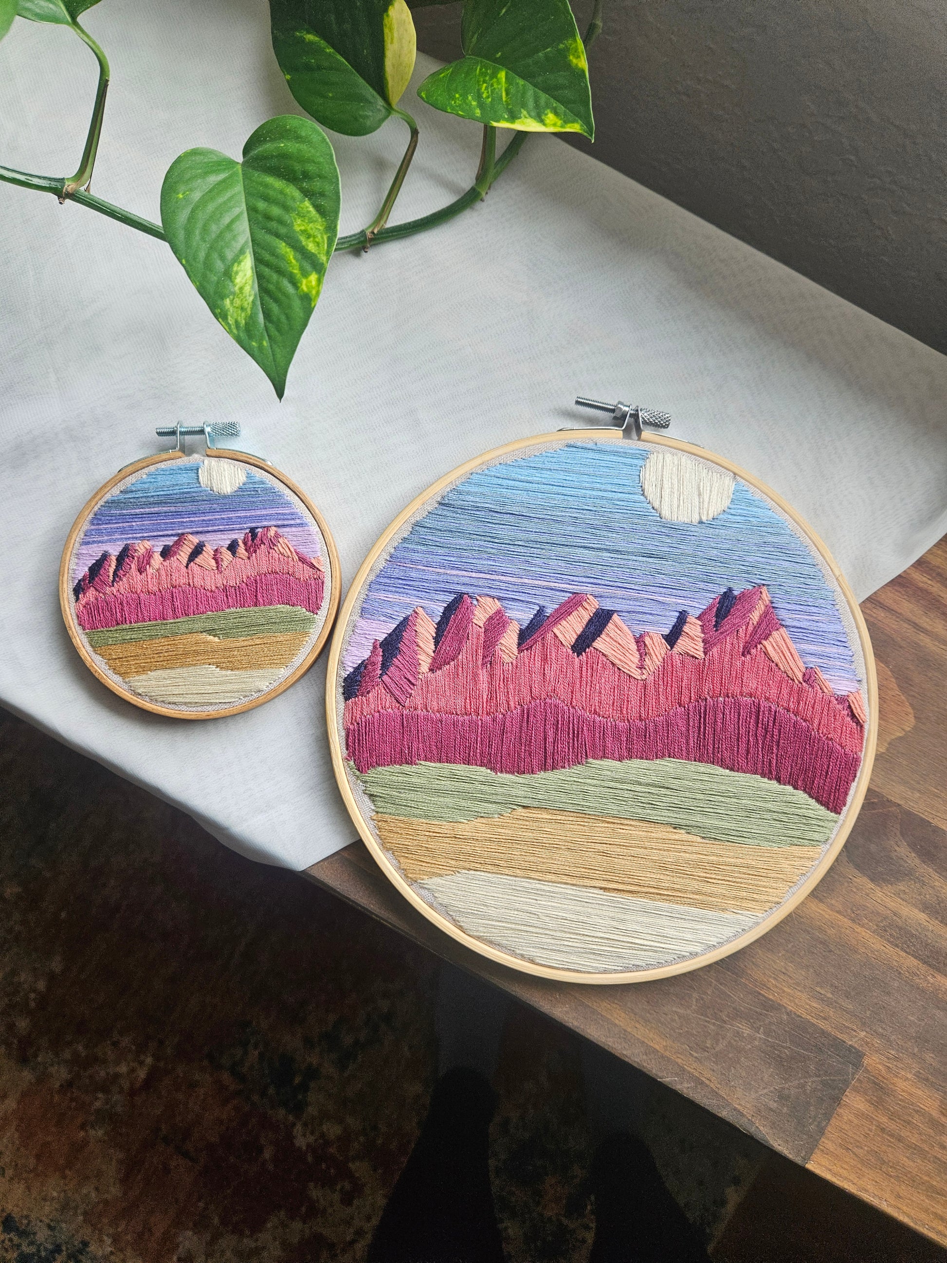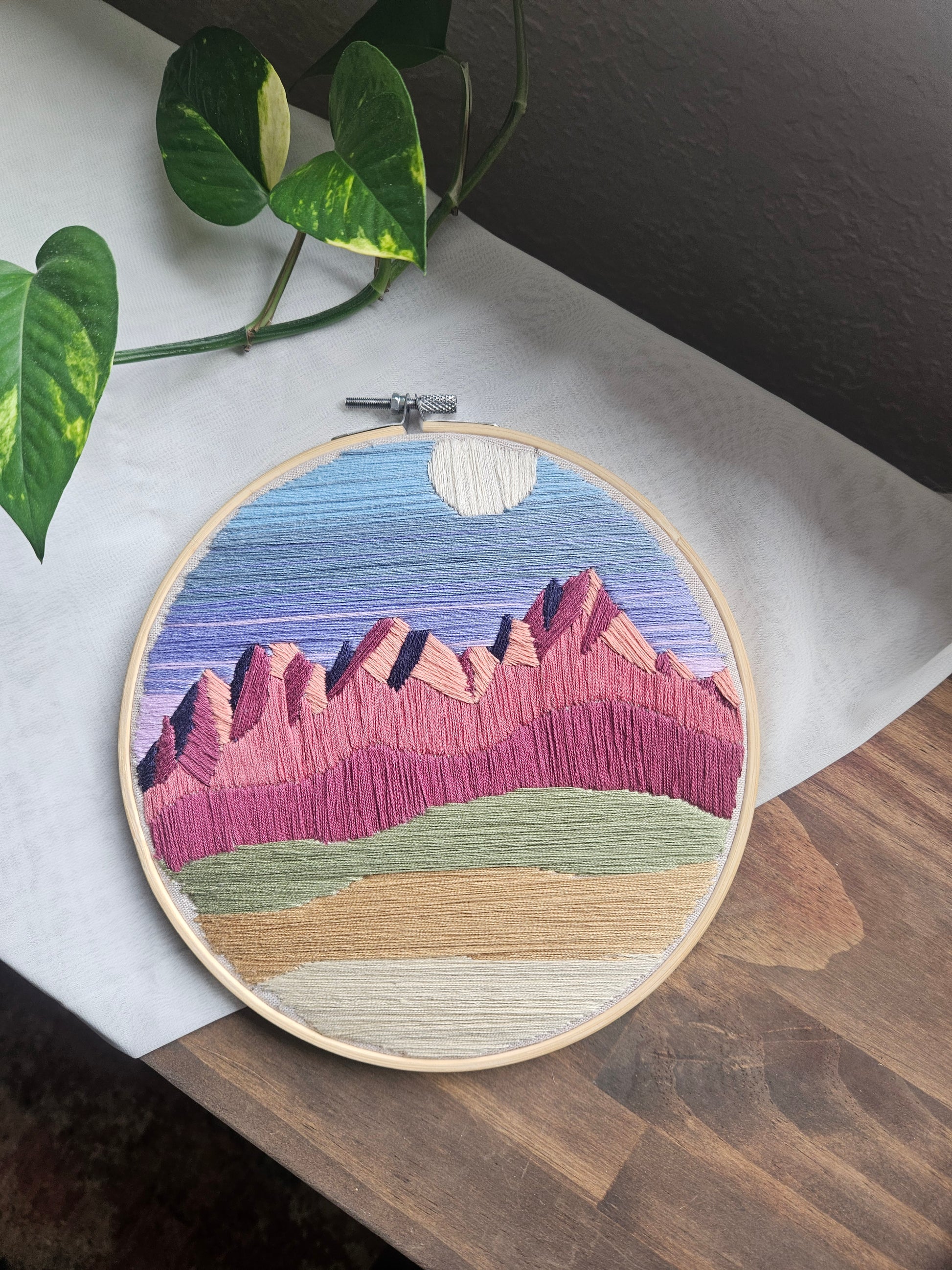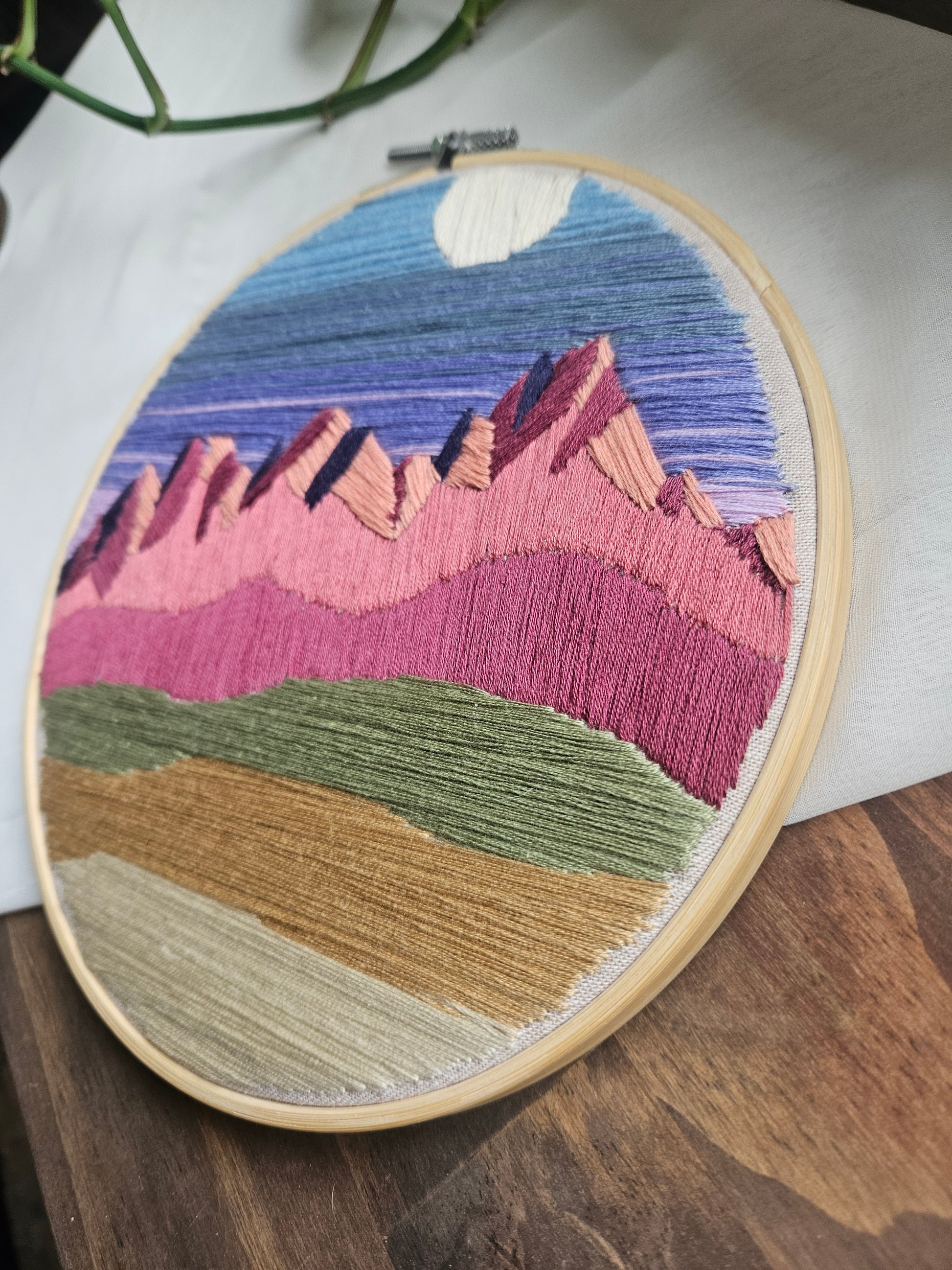 Hand embroidered design of the Las Cruces Organ Mountains at sunset on an 8in hoop.