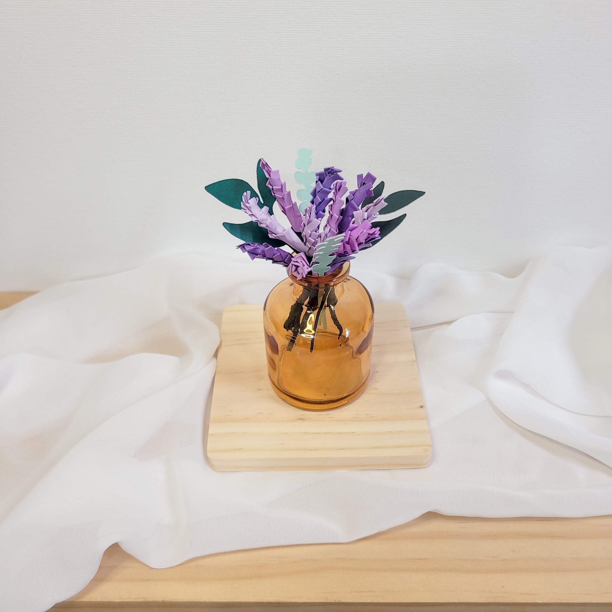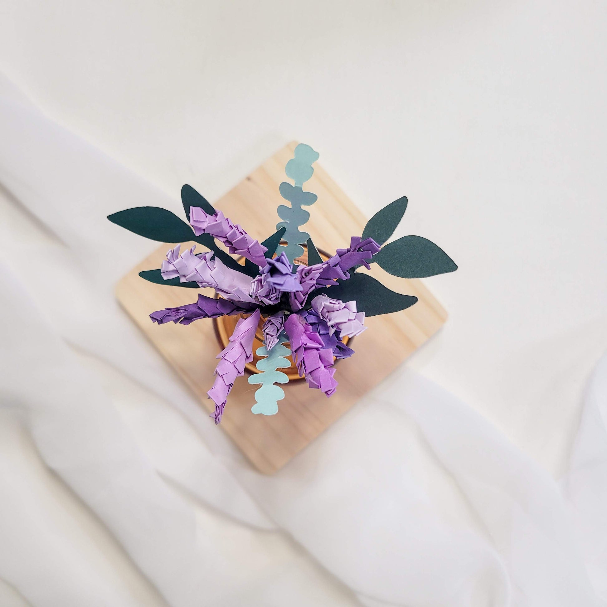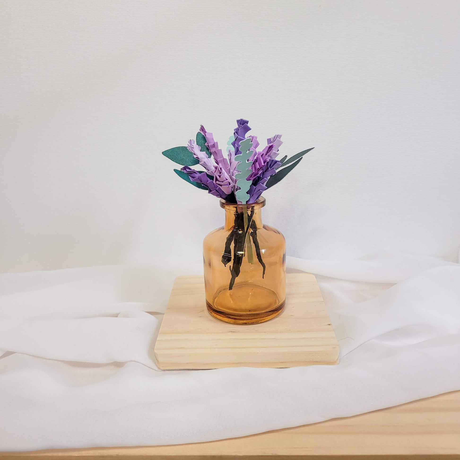 This mini paper lavender bouquet comes with a mix of different lavender shades to offer a lovely pop of purple to your day. It is accented with eucalyptus and greenery for added character. Vase color and style are subject to random selection, but requests can be made.