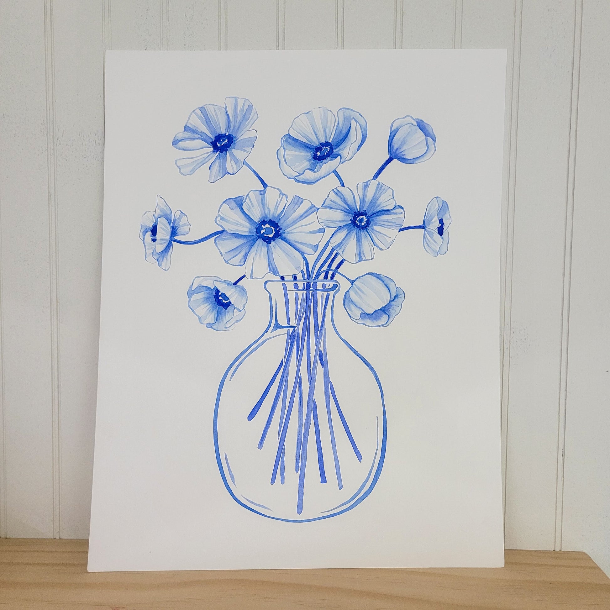 Make a timeless statement with this vintage looking monochrome painting! These ultramarine blue poppies in a vase are sure to bring peace and beauty to any room. Turn your house into a home with this one-of-a-kind original! 💙