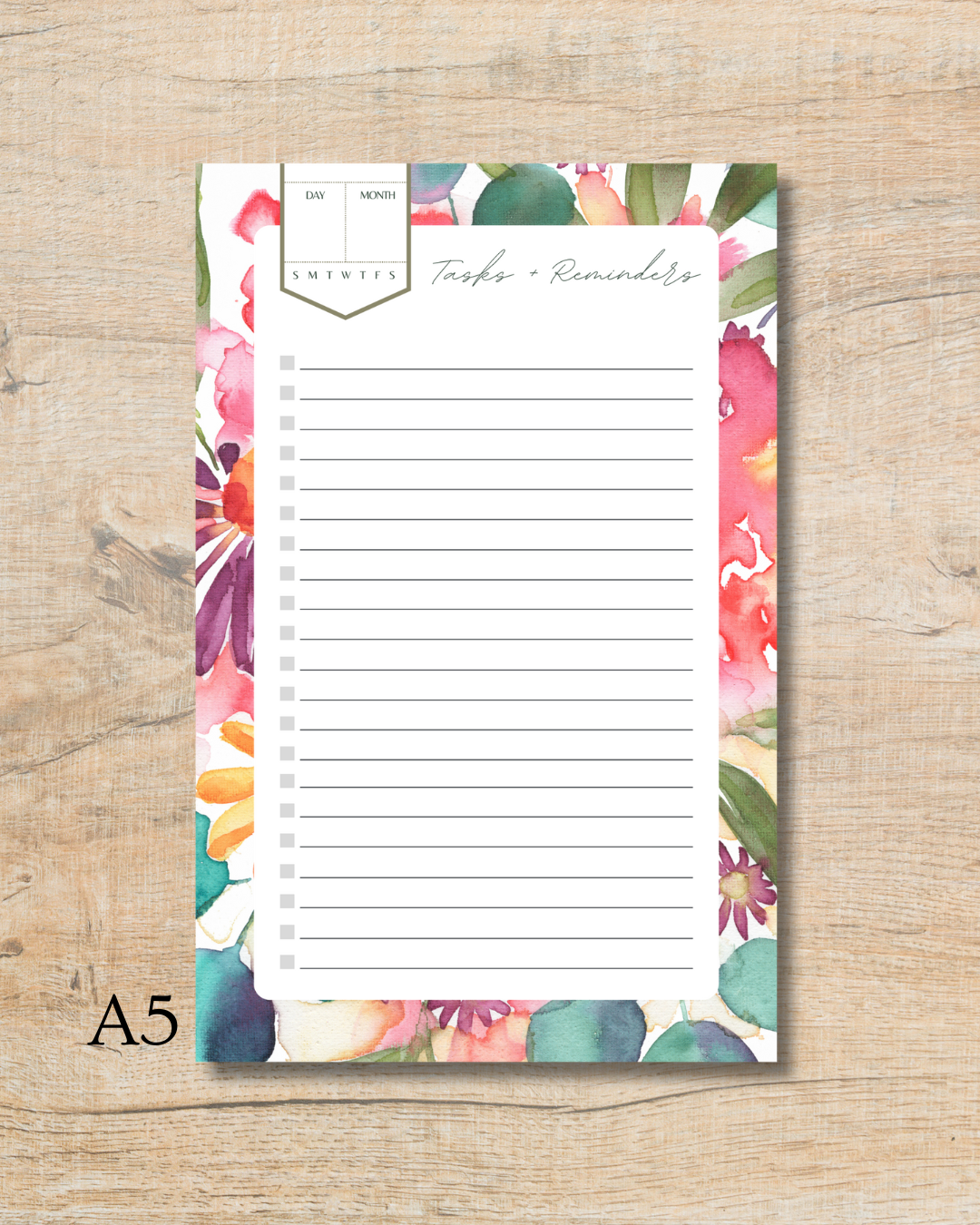 Hand cut and assembled notepad with the "Neon Bouquet" artwork. Each notepad includes 25 tear off sheets. This comes in an A5 (half-page) size.