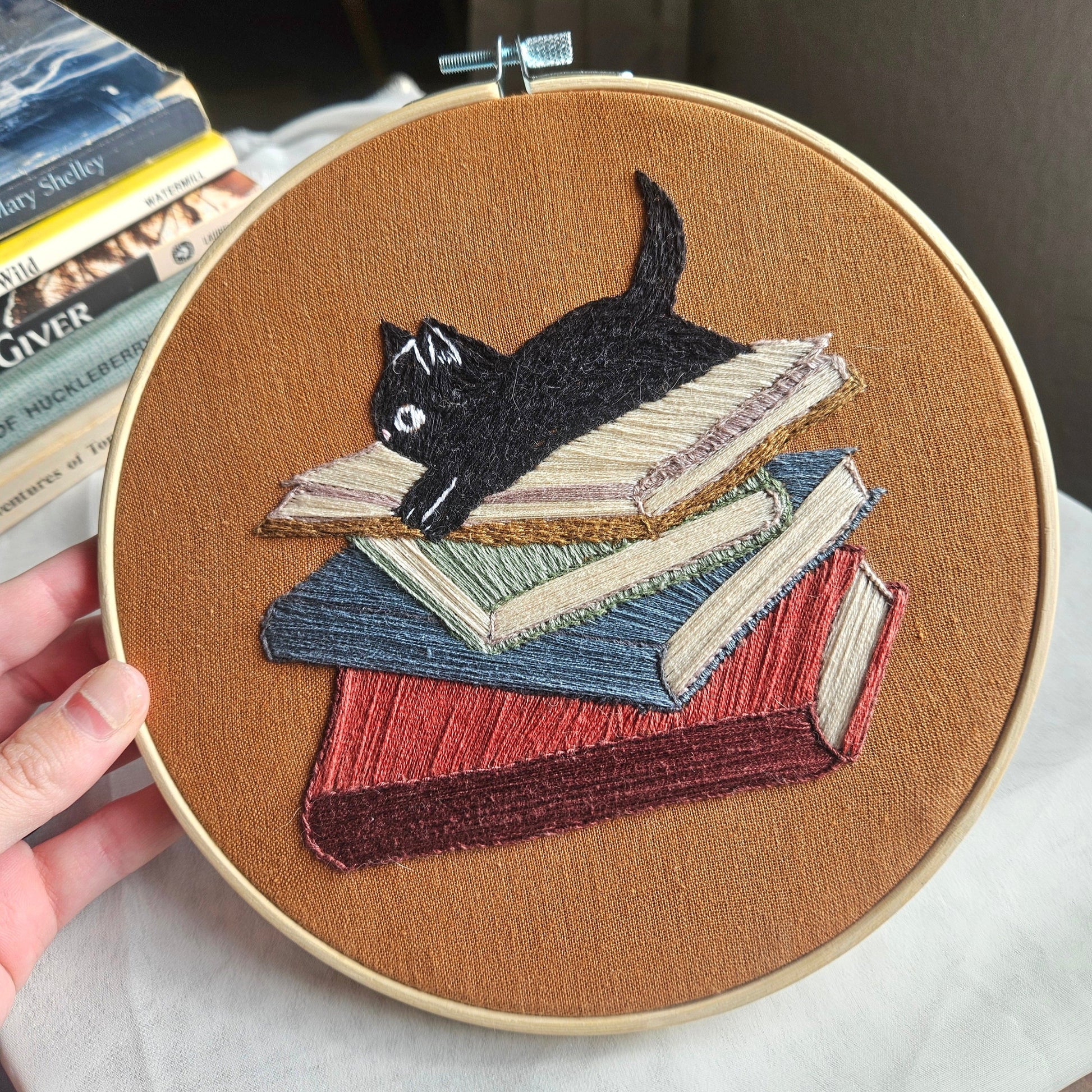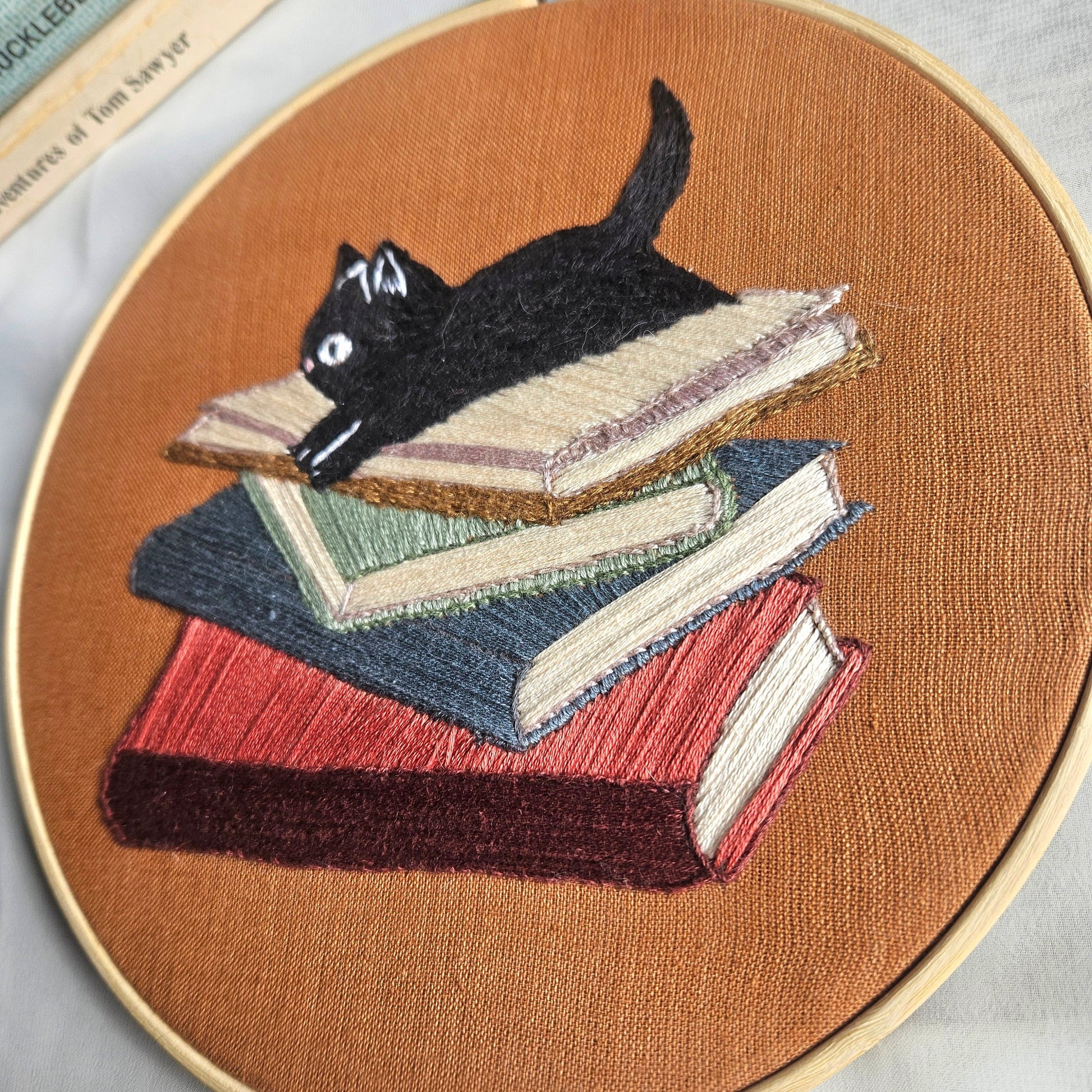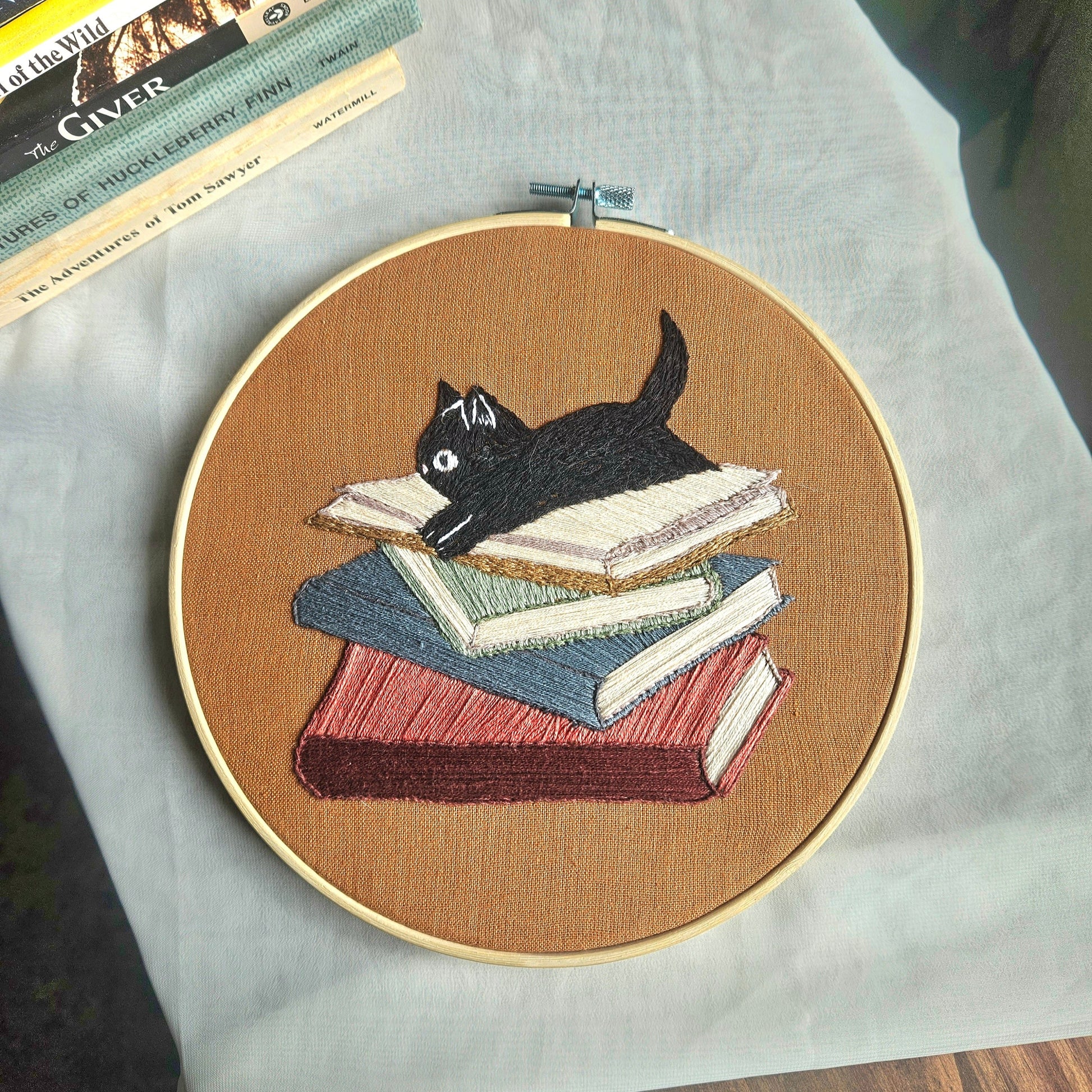 Hand embroidered design of a black kitten and a stack of books on an 8in hoop.