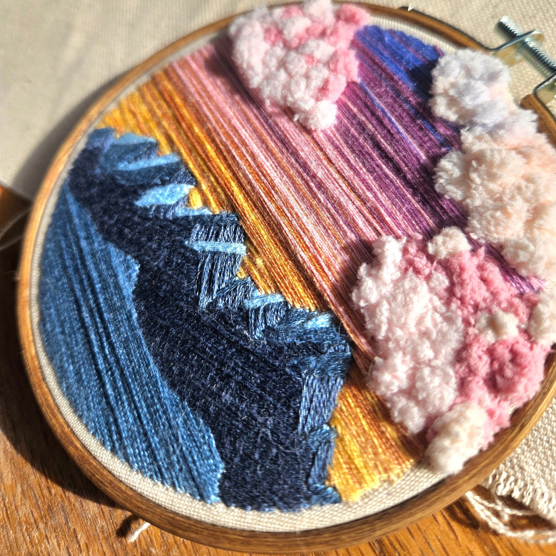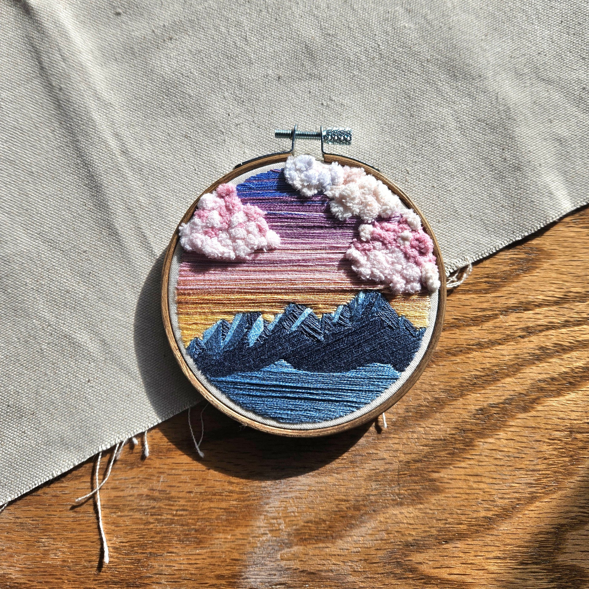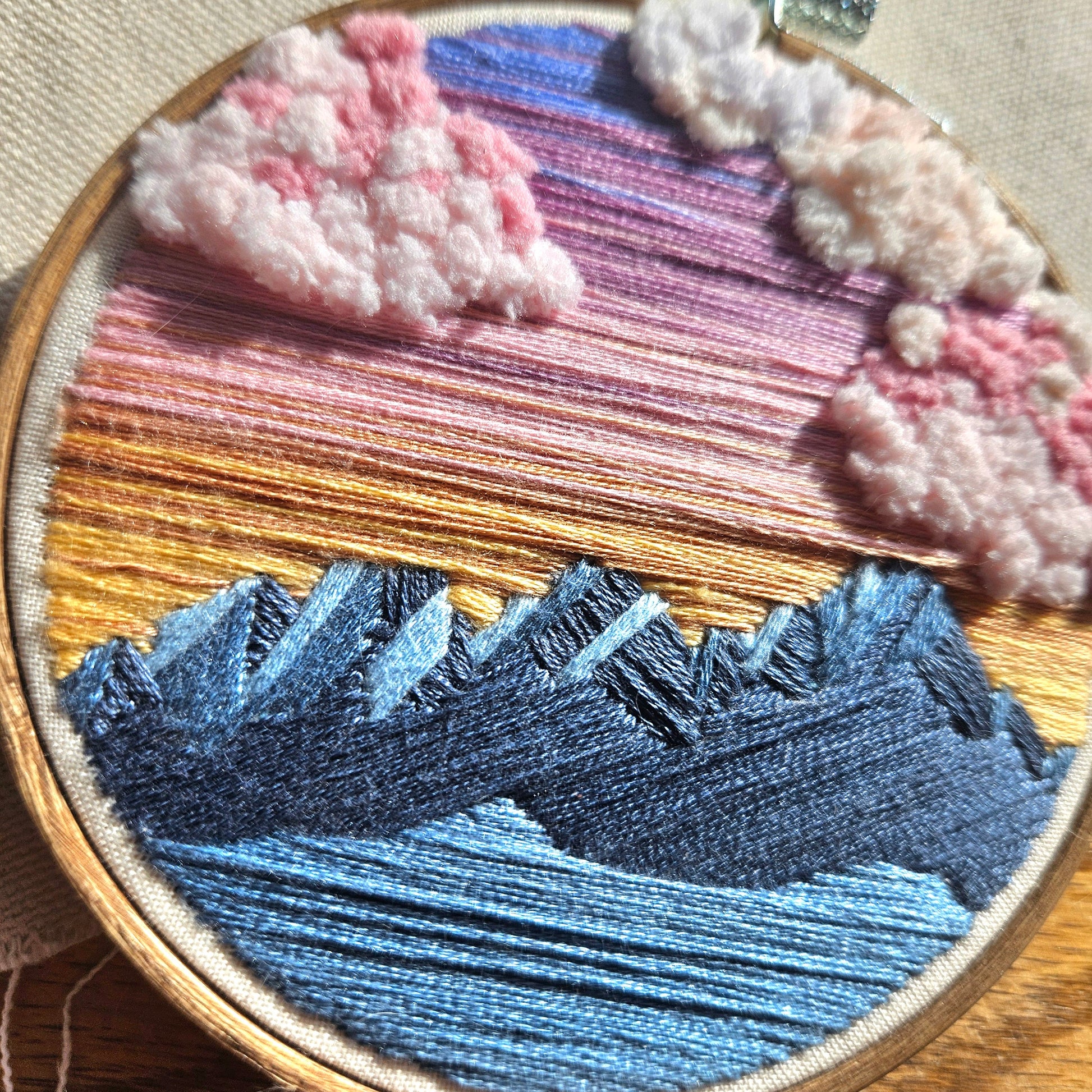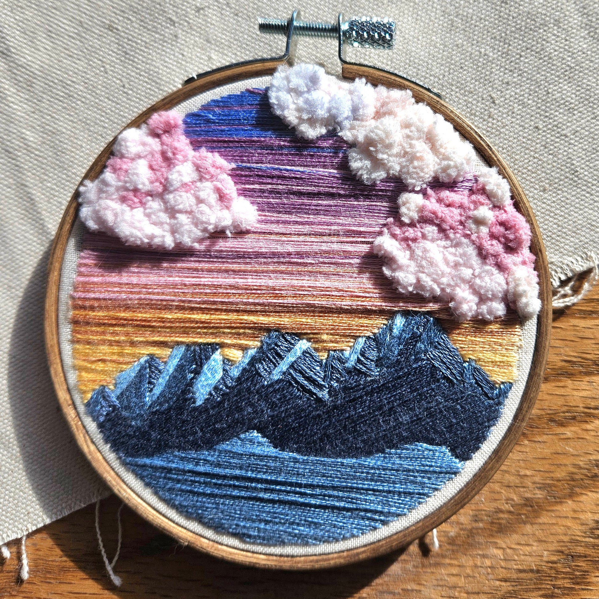 Hand embroidered design of the Las Cruces Organ Mountains at sunrise on a 4 in hoop. Features 3D puffy clouds.
