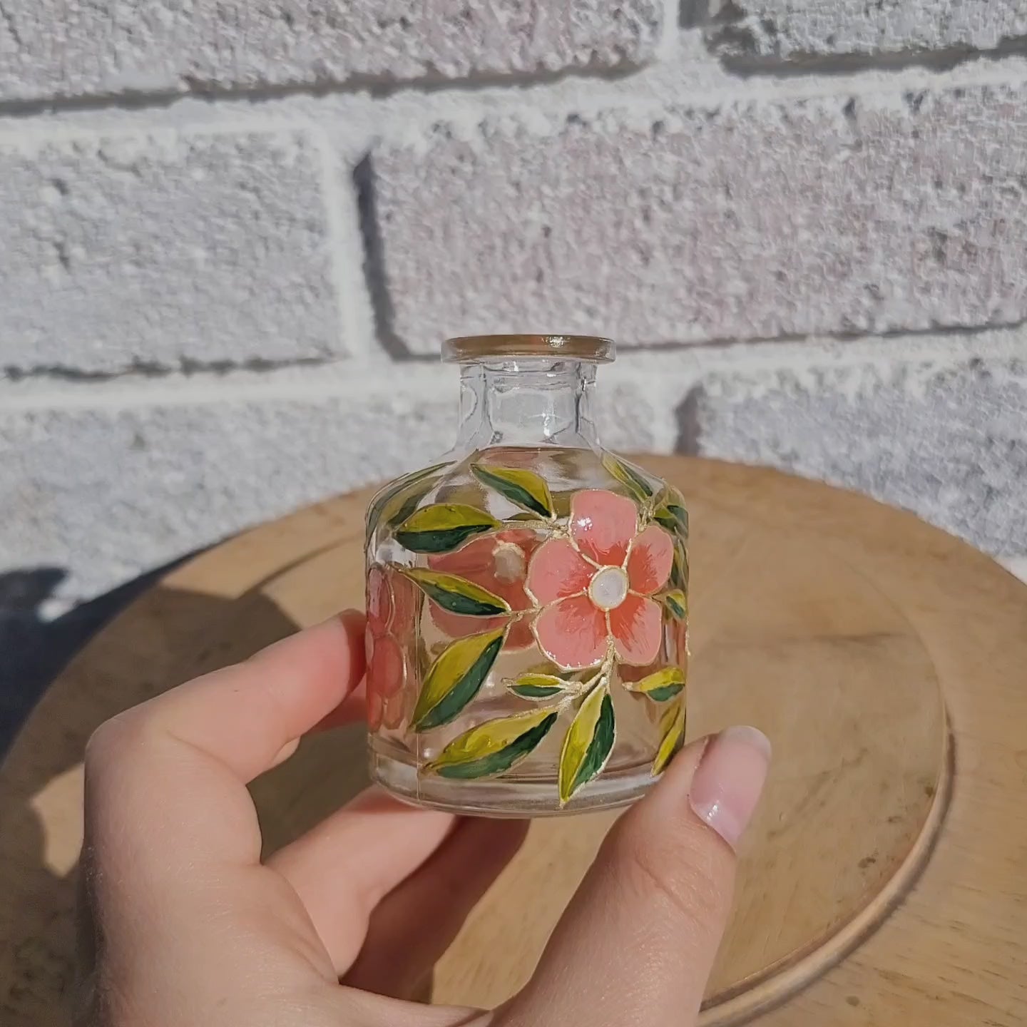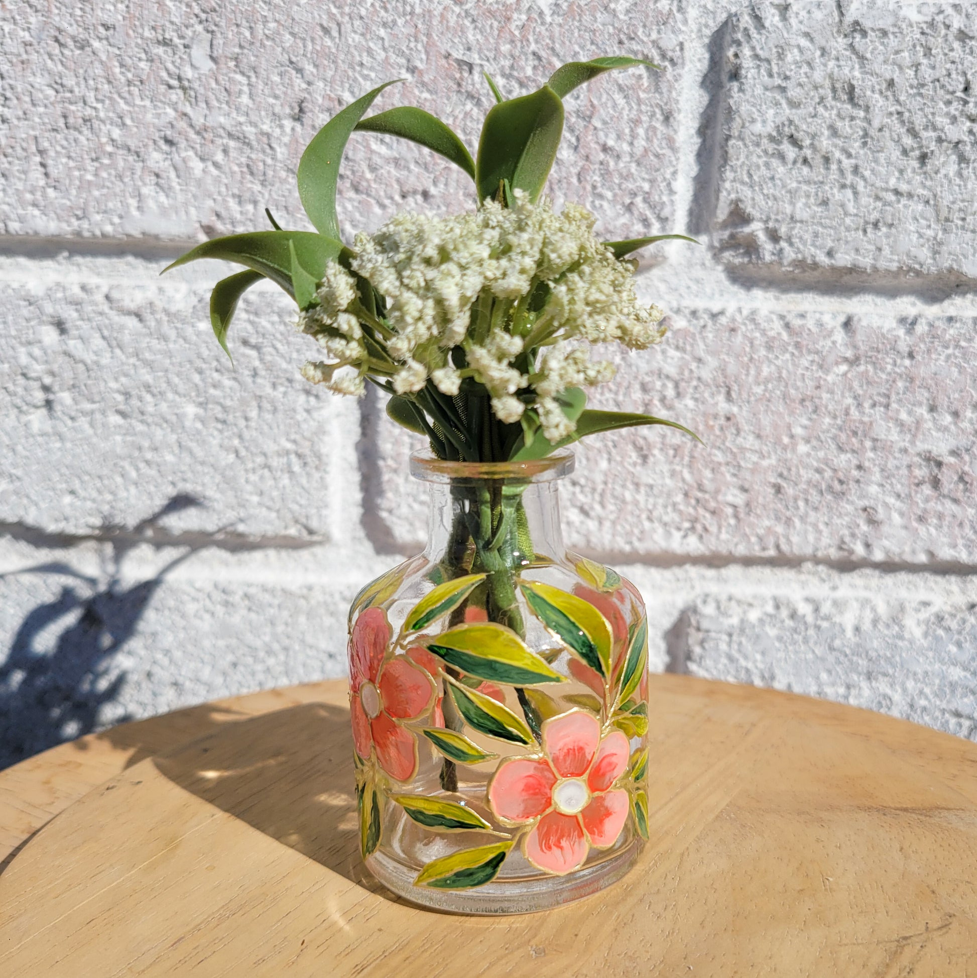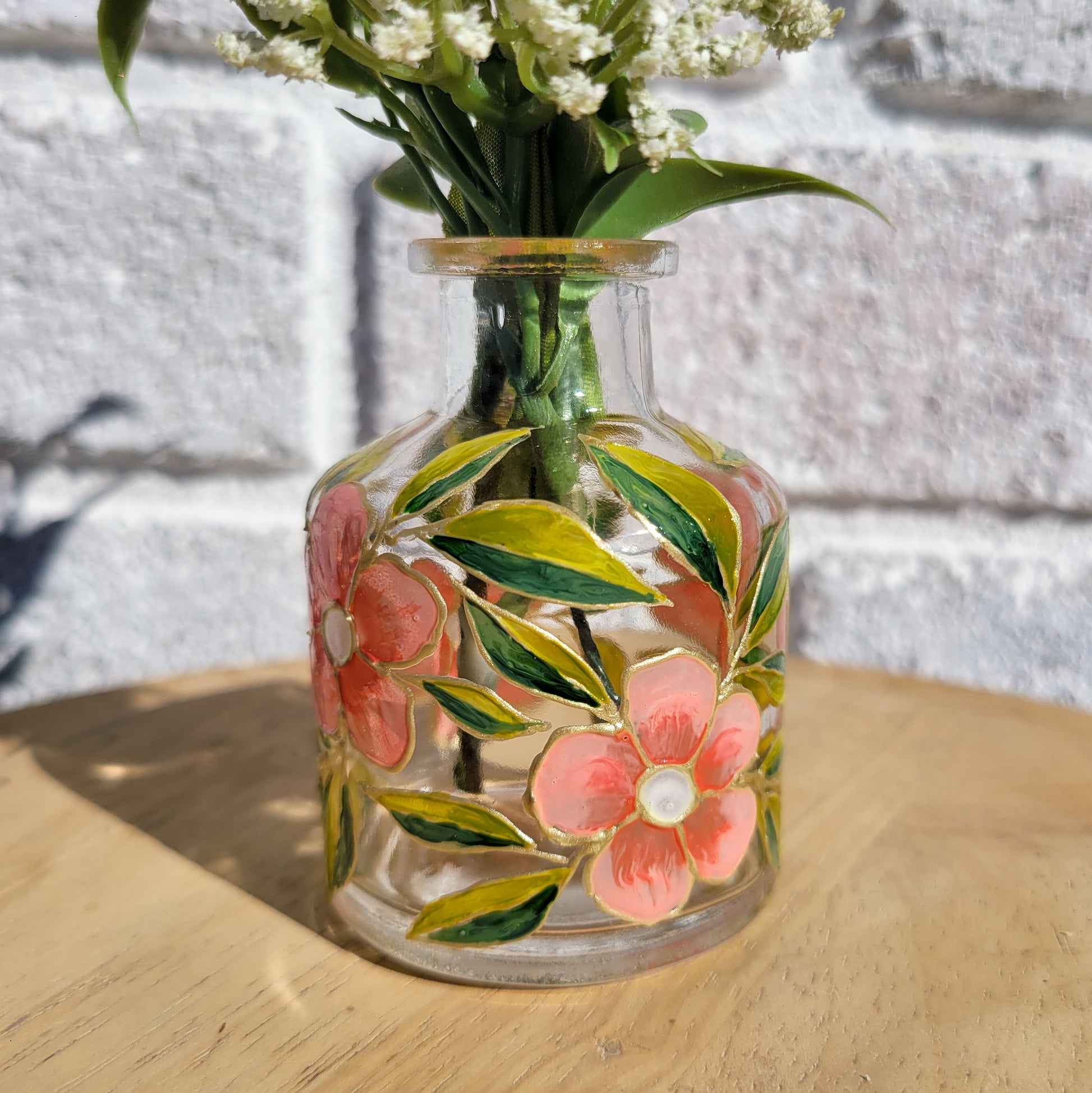 Clear vase with pink flowers and green leaves.