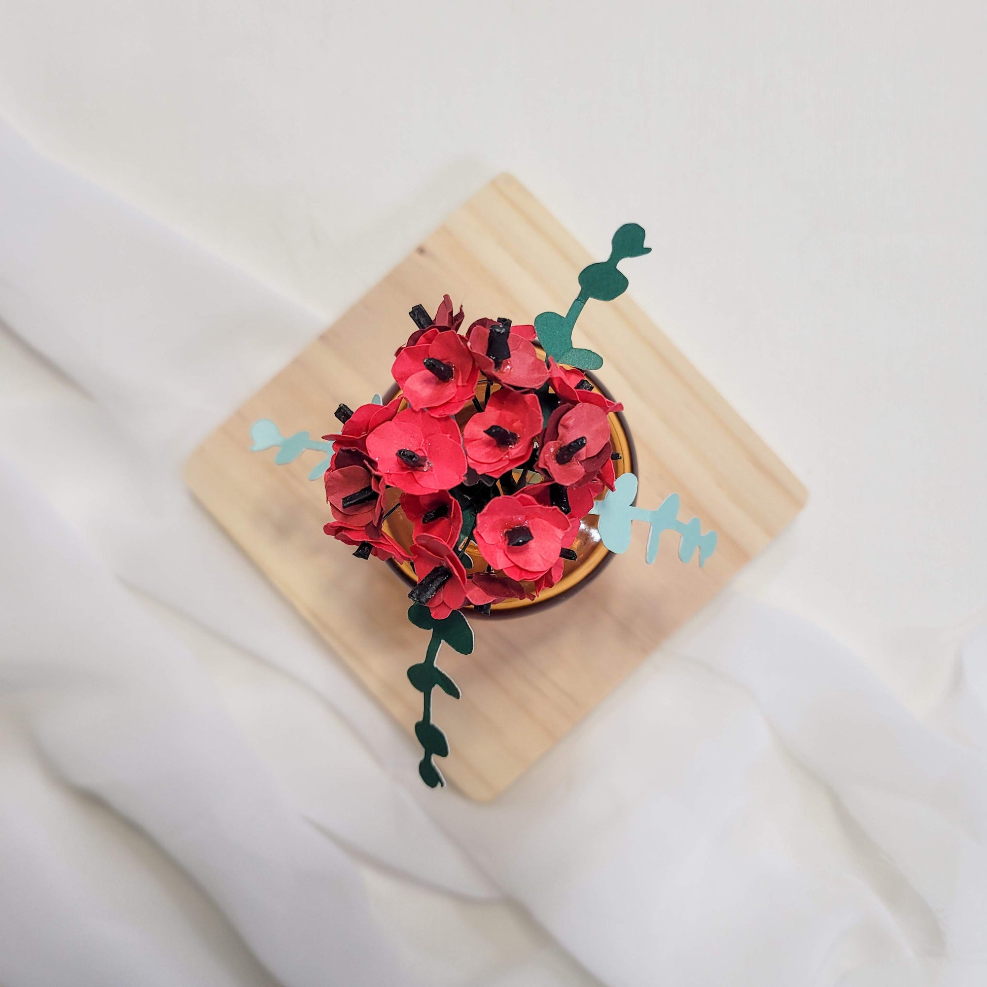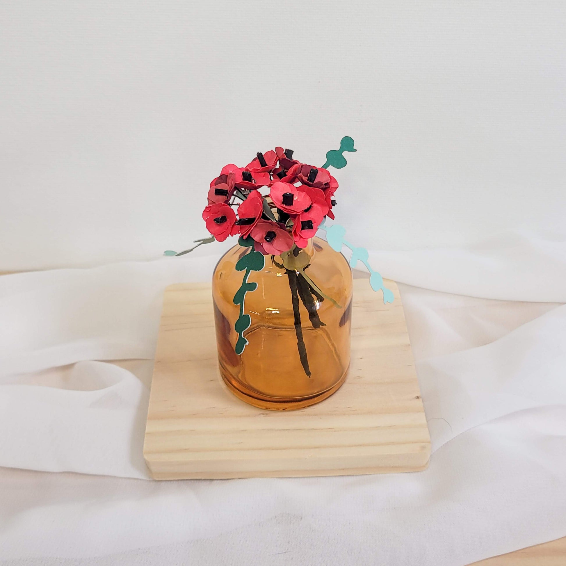 This mini paper poppy bouquet comes with a variety of shades of red to give you a bold pop of color. It is accented with eucalyptus for added character. Vase color and style are subject to random selection, but requests can be made.