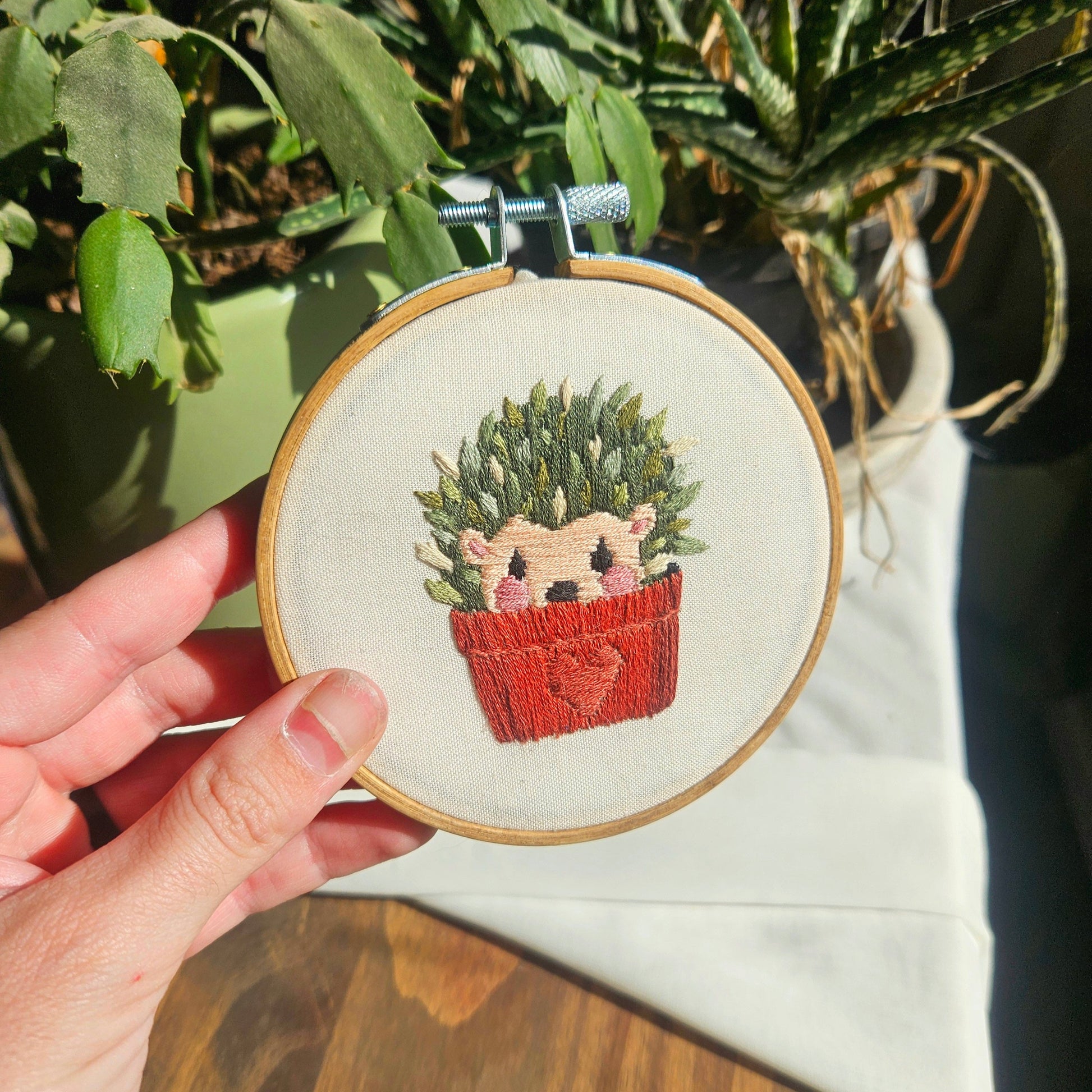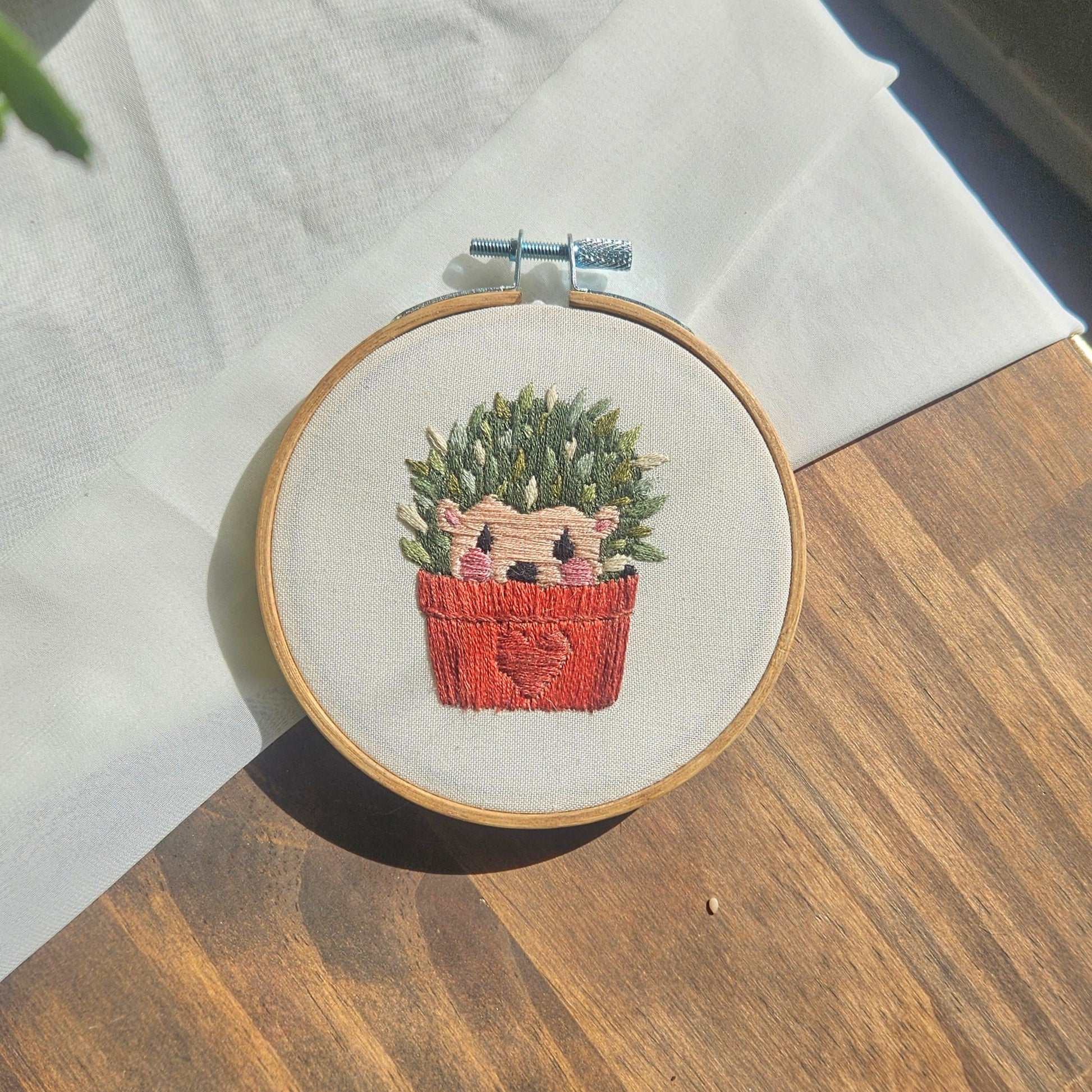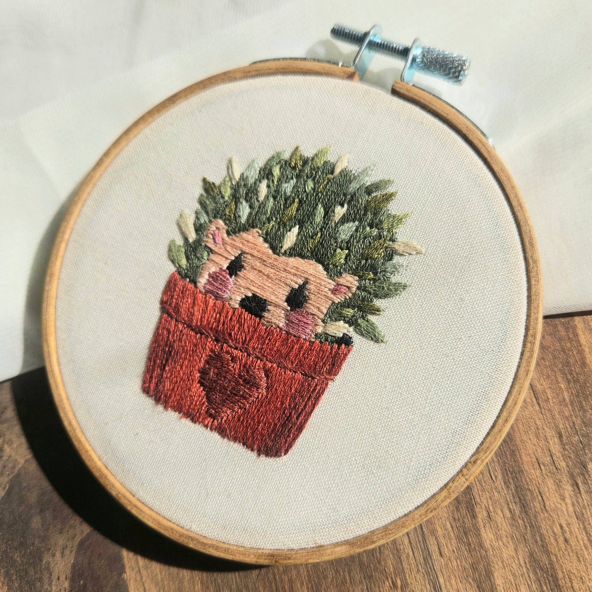 Hand embroidered design of a hedgehog succulent in a cute pot on a 4 in hoop.