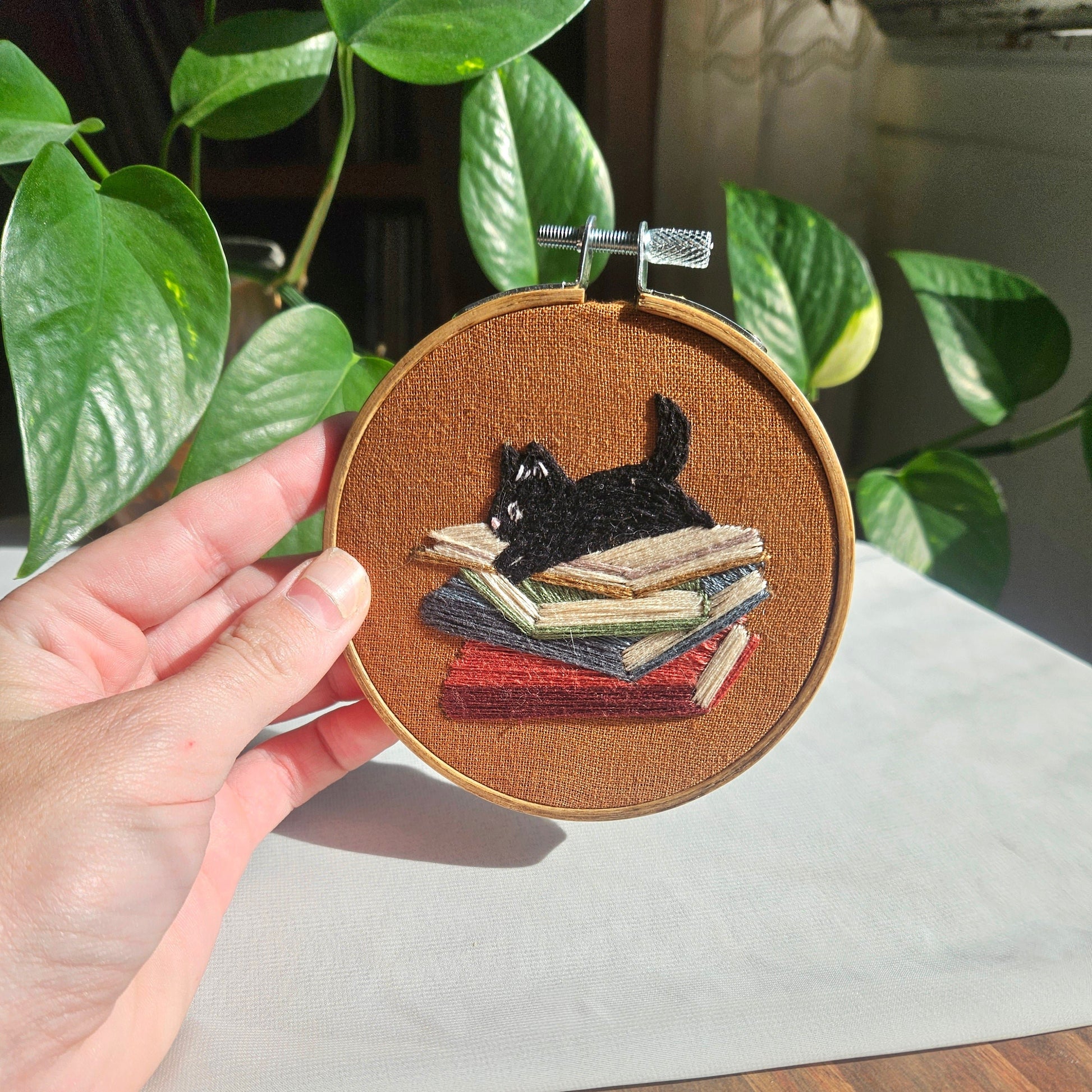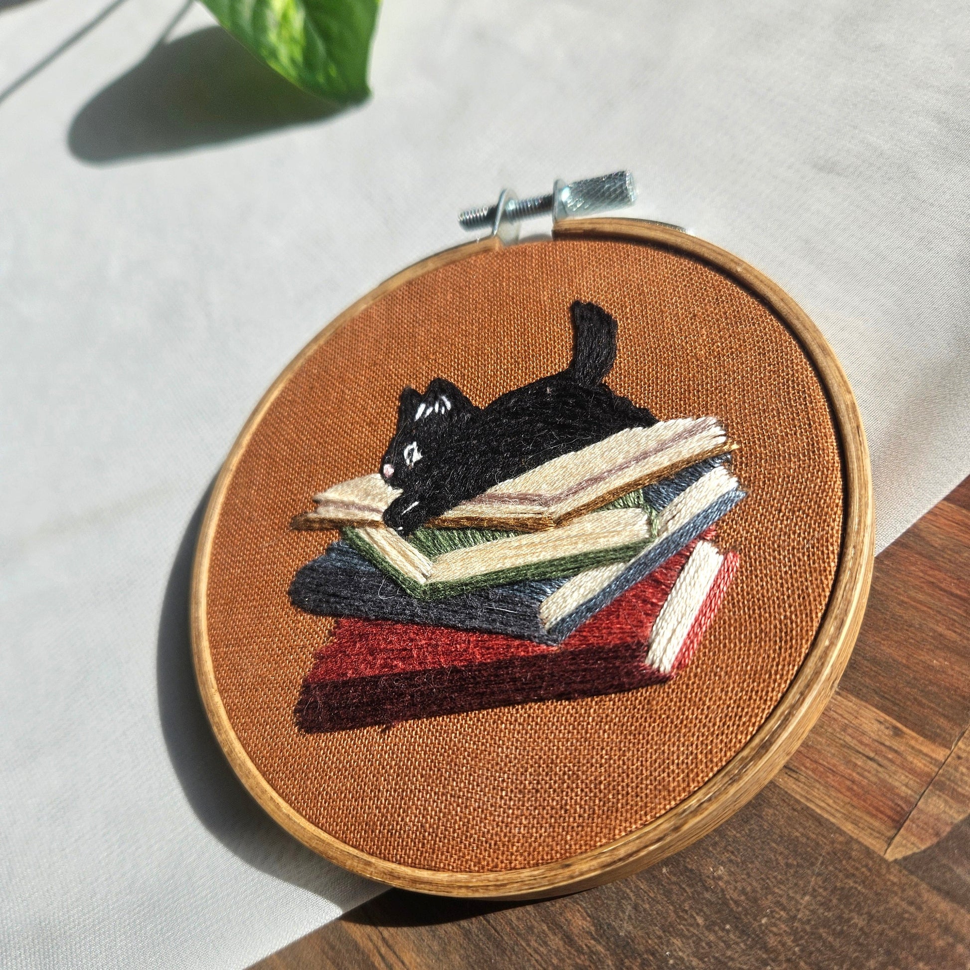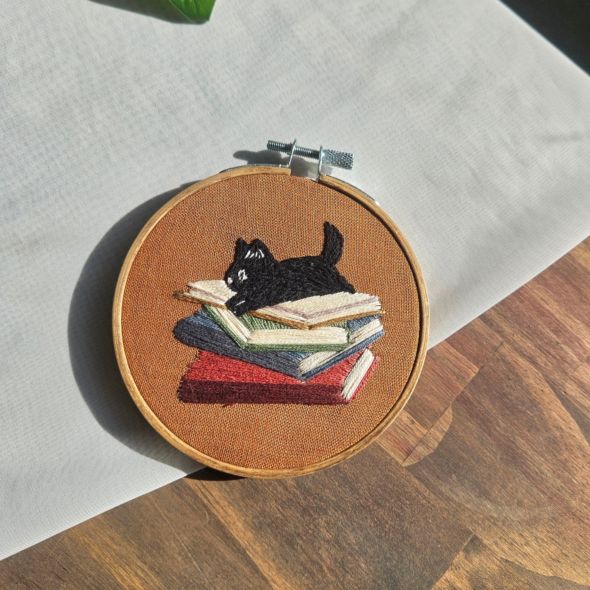 Hand embroidered design of a black kitten and a stack of books on an 4in hoop.