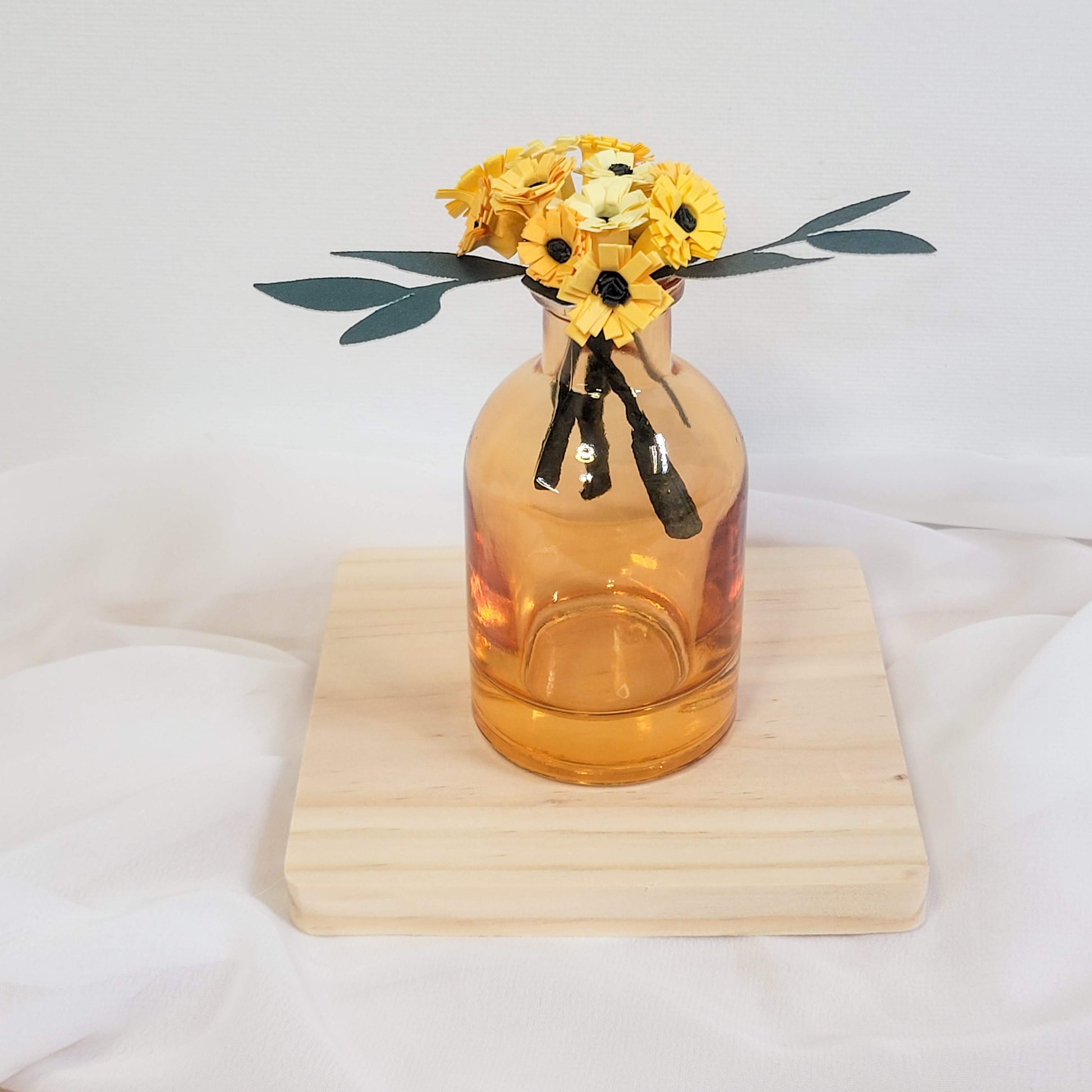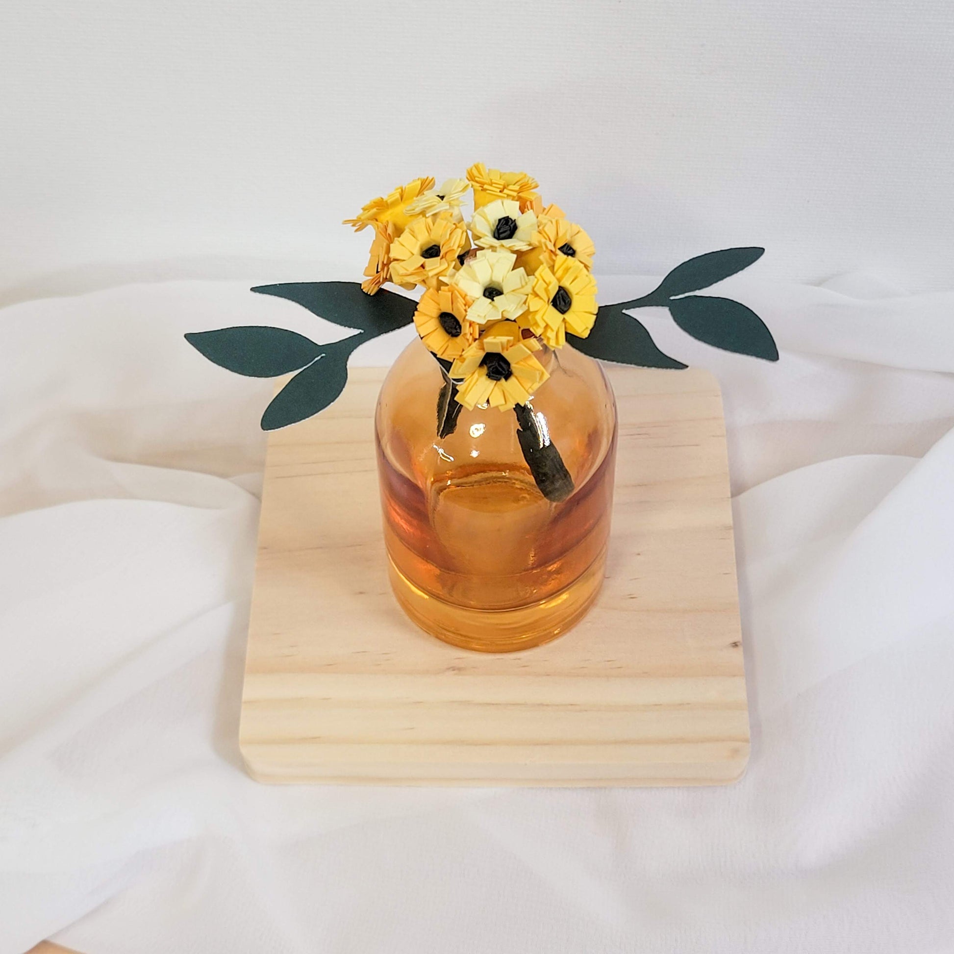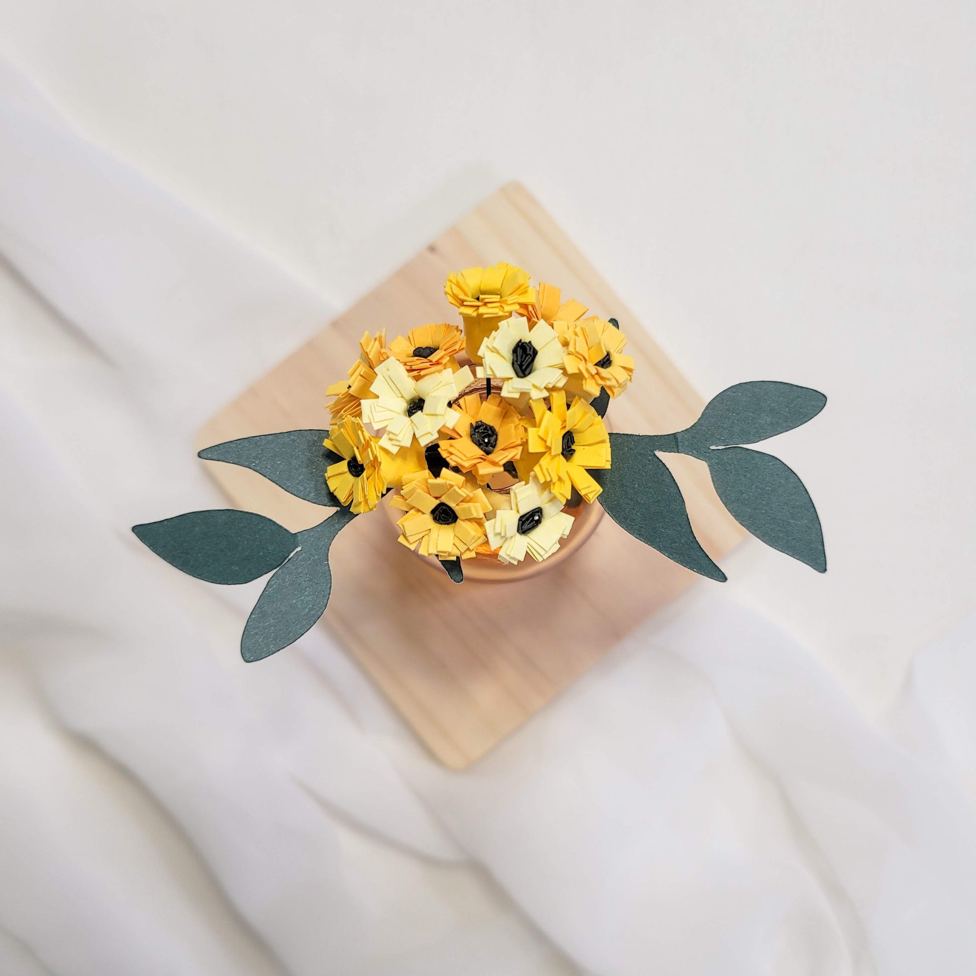 This mini paper sunflower bouquet will brighten your day with a splash of yellows in many shades! It is accented with greenery for added character. Vase color and style are subject to random selection, but requests can be made.