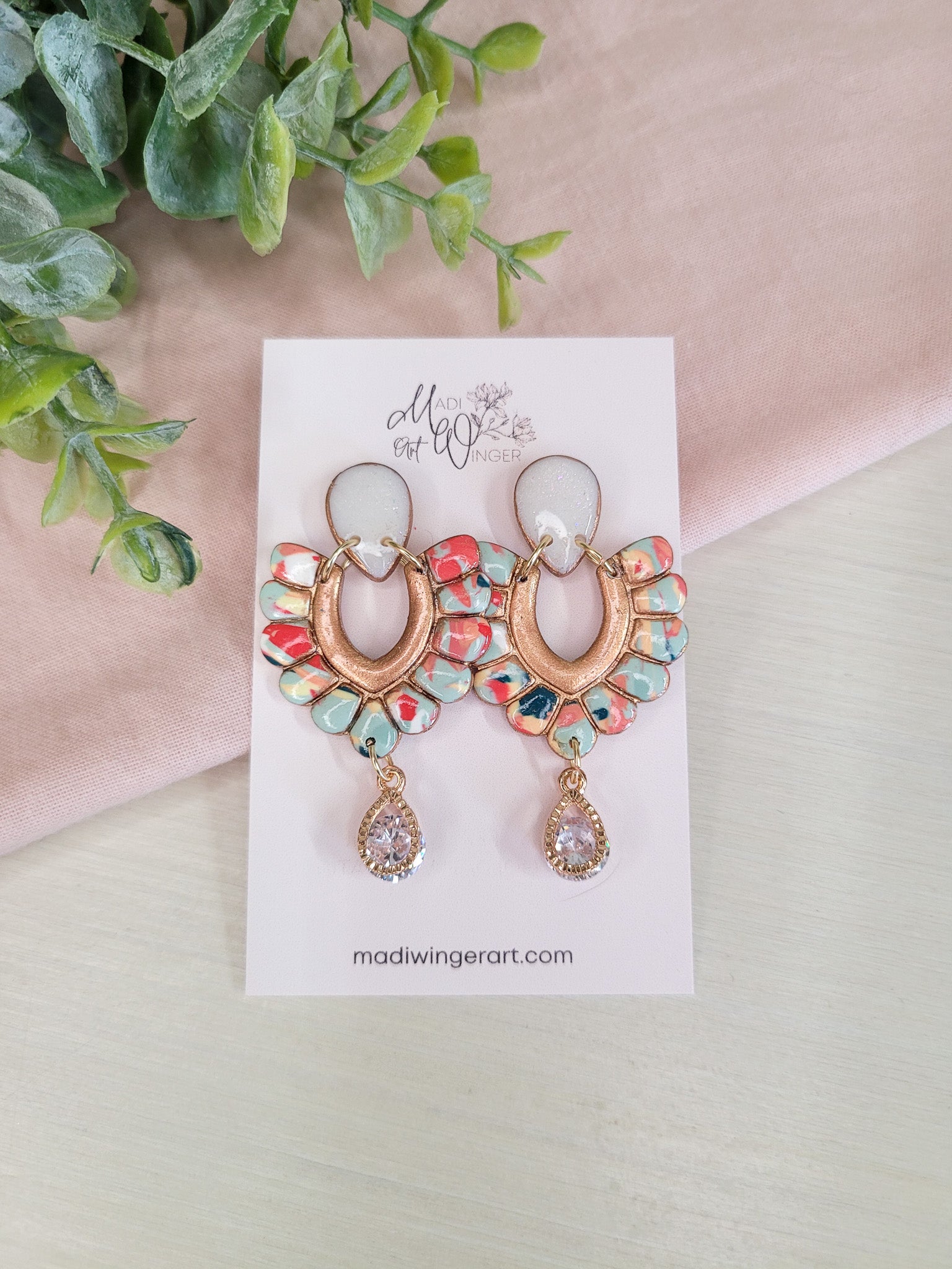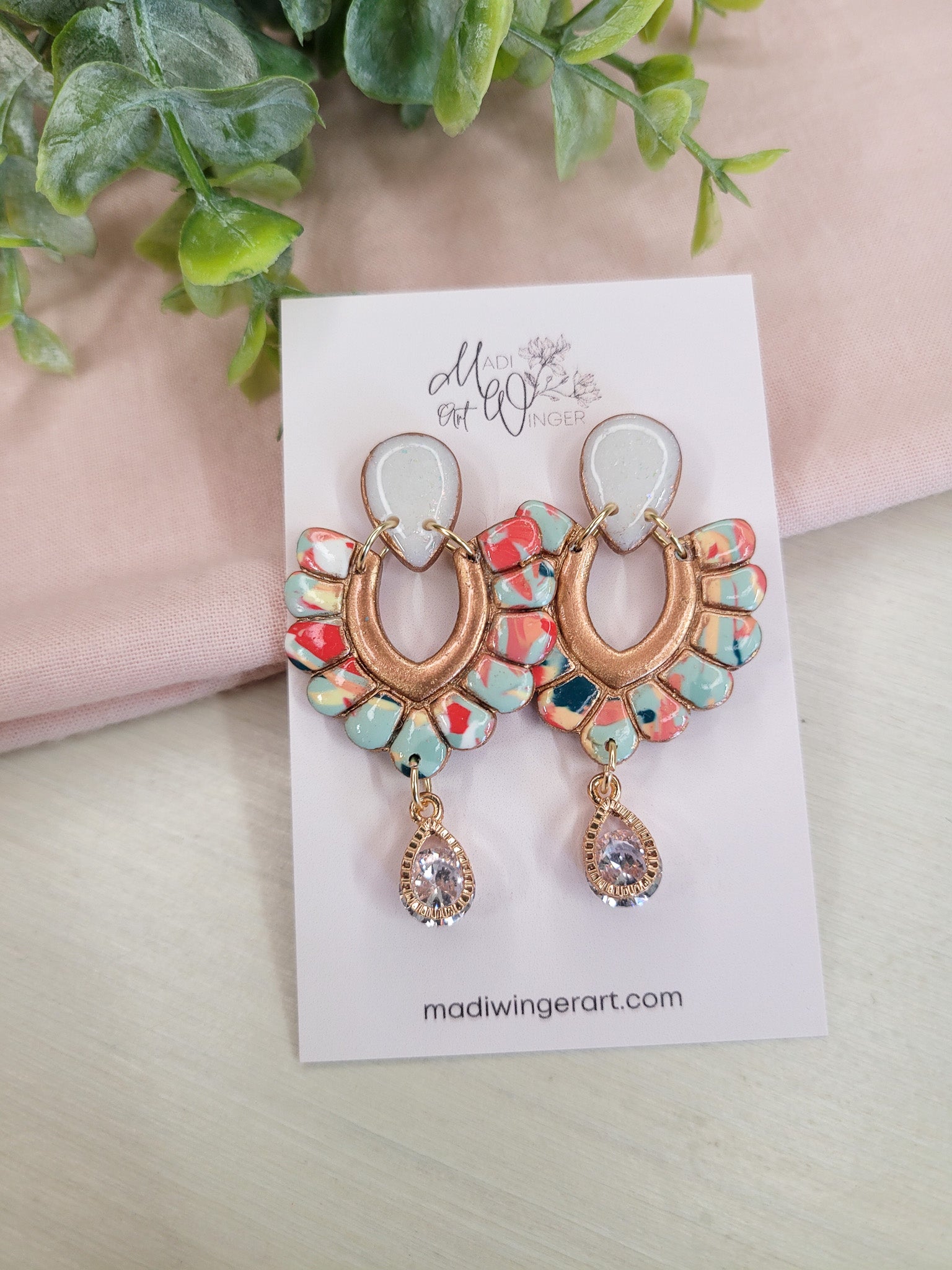 Bright Pinkish Red, Aqua, Orange, and Teal colors. These ones have a sparkly iridescent white top and a cubic zirconia dangle.