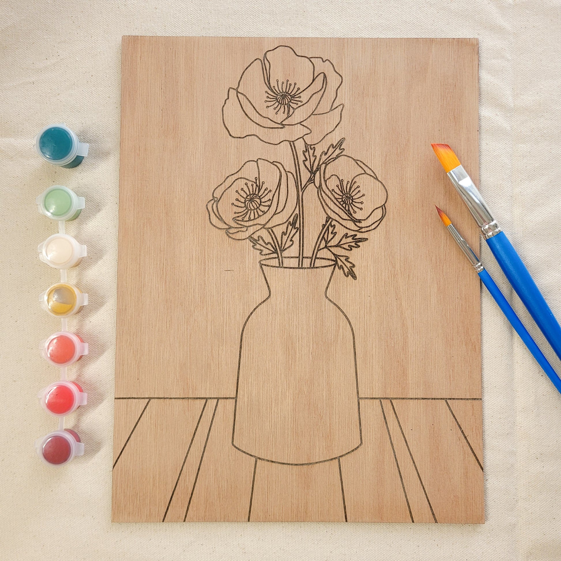 Included is a wood panel with an etched design and all the supplies you need to paint. This kit includes two brushes of different sizes, paints, an example of the finished piece, and sealer to protect your piece!